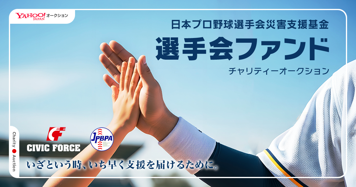 選手会ファンドは2021年12月設立。12球団選手の参加を軸に「自助・共助」の考え方を広げ、発災時の緊急対応から復旧・復興まで継続支援を行う仕組みです。寄付先のCivic Forceは企業・NPO・行政の連携で災害対応を進める公益団体。会場のヤフオクでは取引の安全性向上のため、入札時に本人確認書類の提出と審査を導入しています。