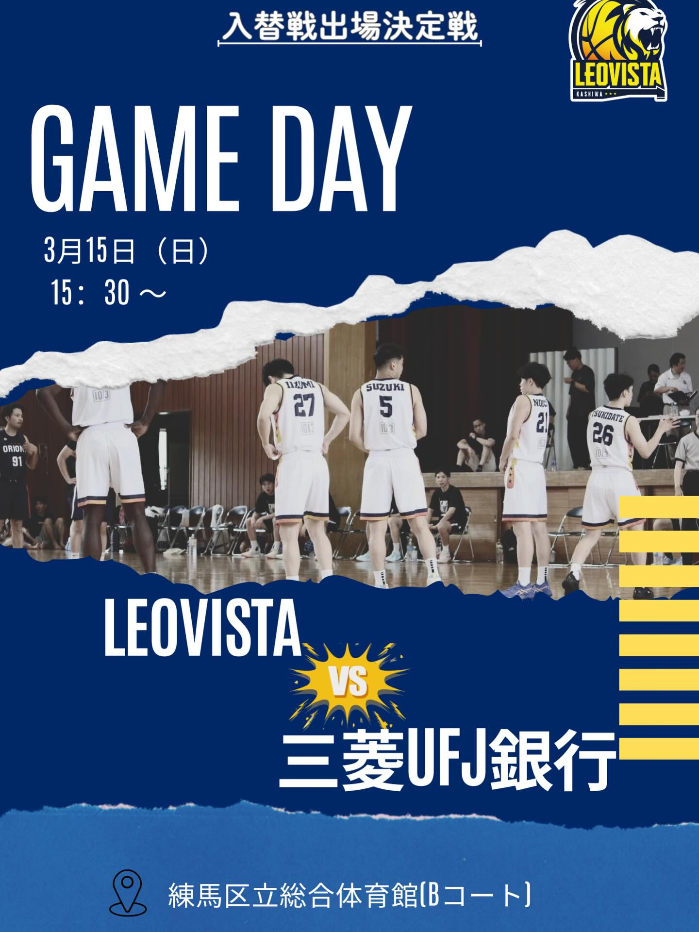 千葉県柏市を拠点とするバスケットボールクラブ「LEOVISTA KASHIWA(レオヴィスタ柏)」は、2025年度SBL男子関東SB2リーグ入替戦に出場し、3月22日(日)15:00に東京都練馬区の練馬区立大泉学園町体育館でTISインテックグループ(SB2リーグ12位)と対戦します。発表は3月21日9時に行われました。