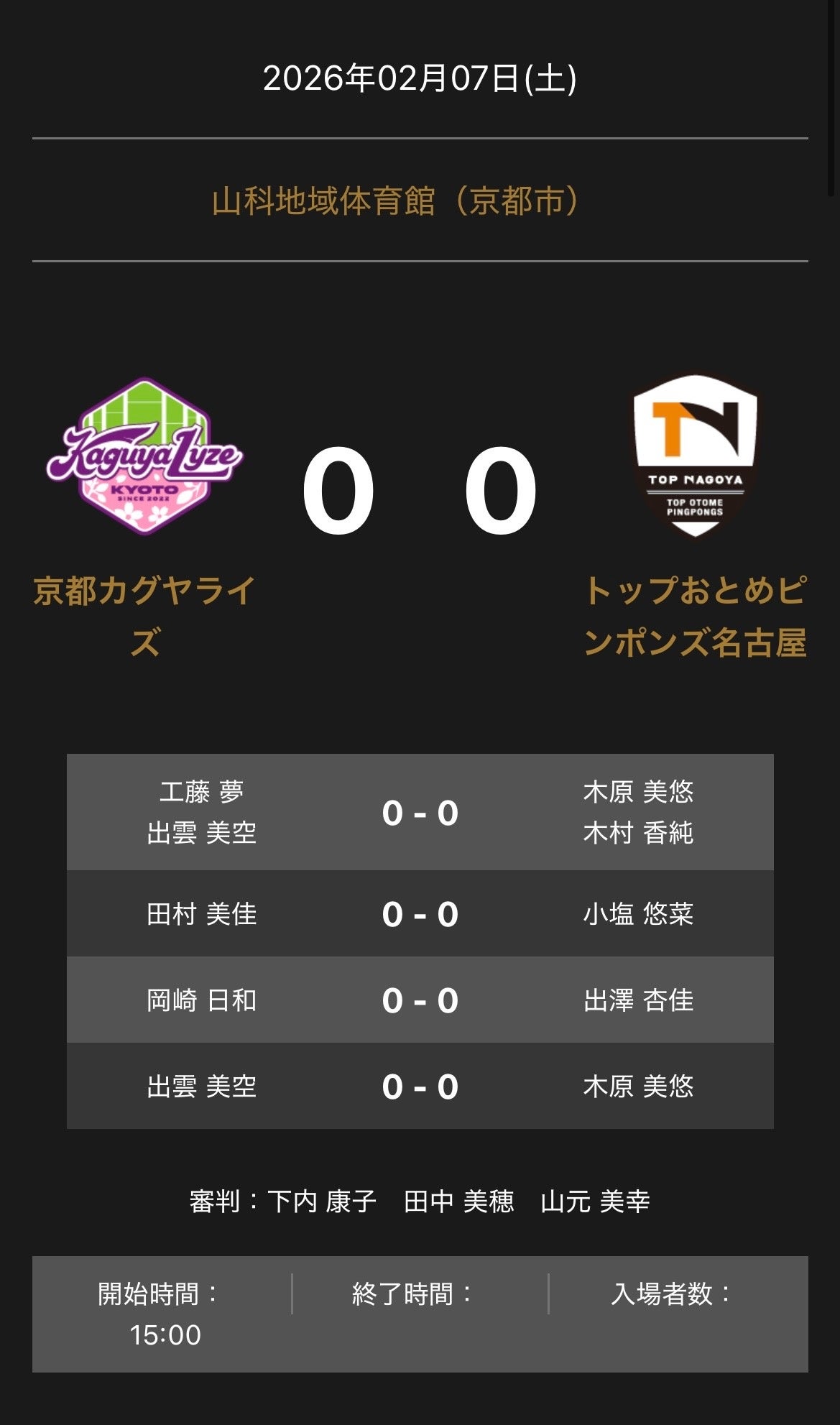 ノジマTリーグ 2025-2026シーズン 公式戦 2月7日開催 京都カグヤライズ vs トップおとめピンポンズ名古屋 対戦オーダー発表