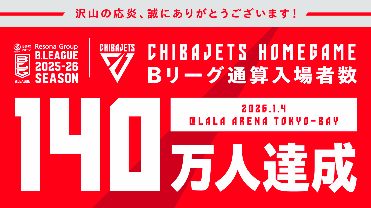 BリーグB1の千葉ジェッツふなばしは2026年1月4日の富山グラウジーズ戦で、レギュラーシーズンの公式記録に基づくホームゲーム通算入場者数が140万人を超えました。クラブはBリーグ最速での到達だとしています。今季も2026年1月8日時点で平均入場者数1万人超を維持しており、リーグ上位水準の集客が続いています。通算の節目は10万人が2017年3月12日、100万人が2024年10月20日で、そこから約1年3カ月で140万人に到達しました。昨季からホームアリーナを「ららアリーナTOKYO-BAY」に移転し、メディア露出やSNS発信、地域活動を通じて来場機会を広げてきたことが動員の下支えになったと説明しています。今後も千葉県エリアに根差した運営を続け、スポーツ観戦を軸にしたエンターテインメントの質を高められるかが、集客の持続と地域への波及を左右しそうです。