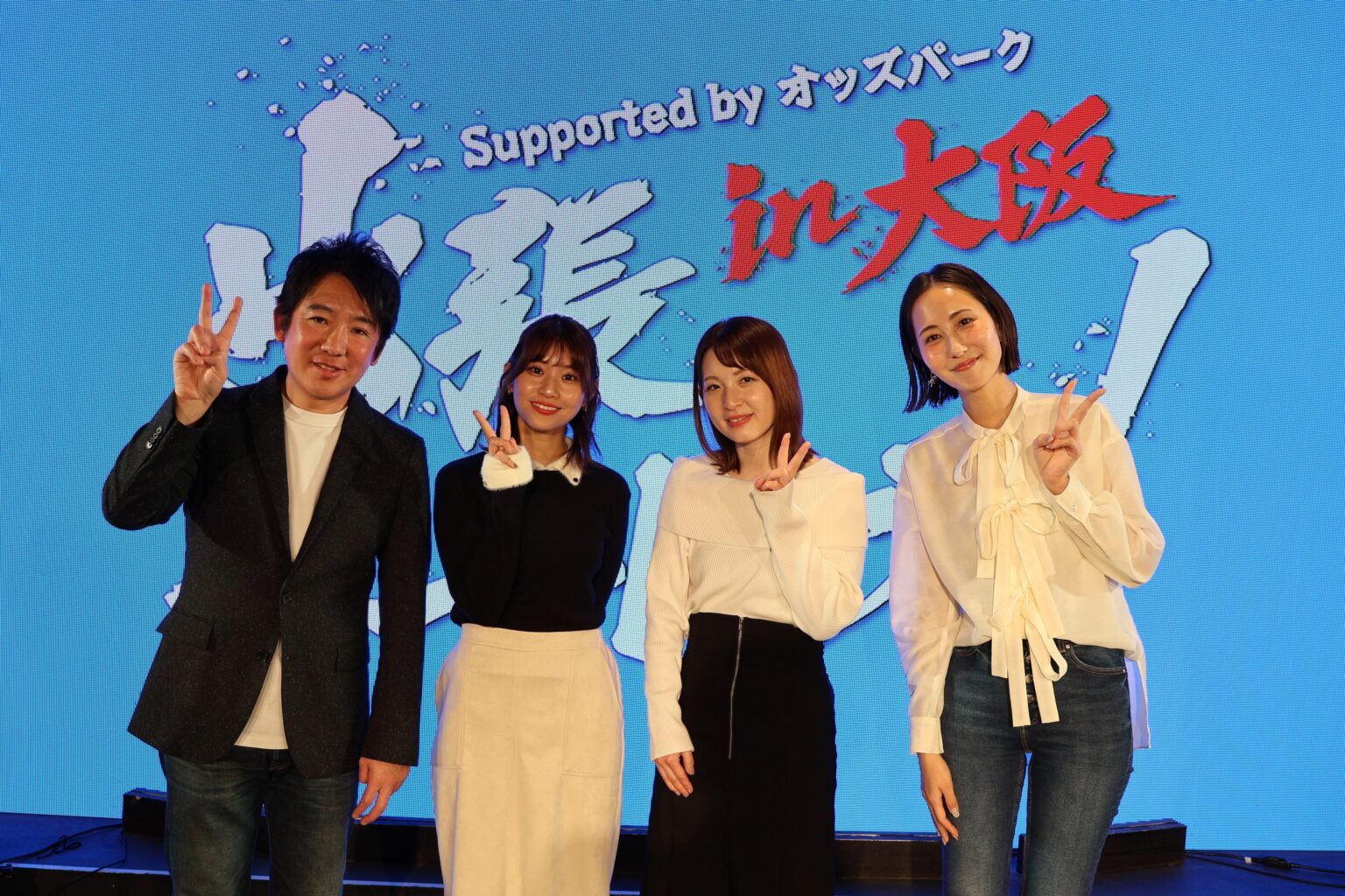イベントはJKA×オッズ・パークのコラボ第2弾で、オートレース場が近隣にない大阪で現地に近い観戦空間を用意した点が特徴です。MCは堂前英男さん、アシスタントは渚さんが務め、音響演出と生実況で臨場感を高めました。