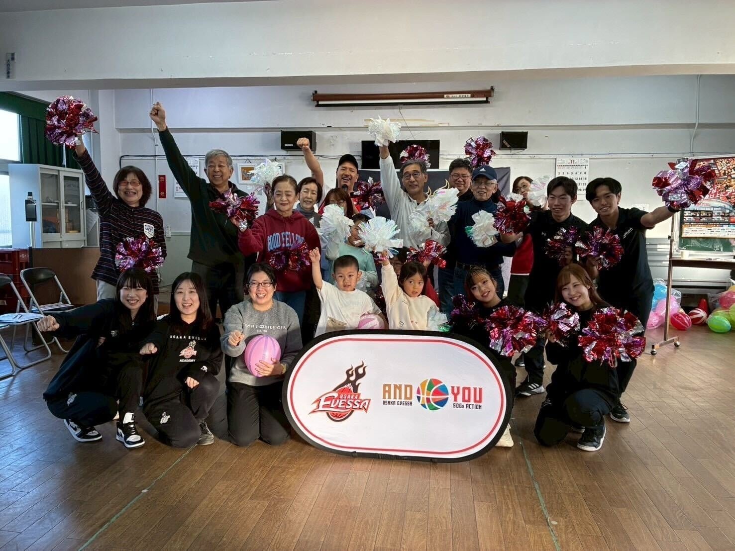 プロバスケットボールB.LEAGUE所属の大阪エヴェッサが、2025年11月29日に大阪市城東区の諏訪会館で「つなぐスポーツ体験+未来まちづくり体験」の第1回を行いました。約1時間のプログラムでは、前半30分を健康運動、後半30分をチアダンスにあて、幅広い世代の参加者が身体を動かしながら交流しました。