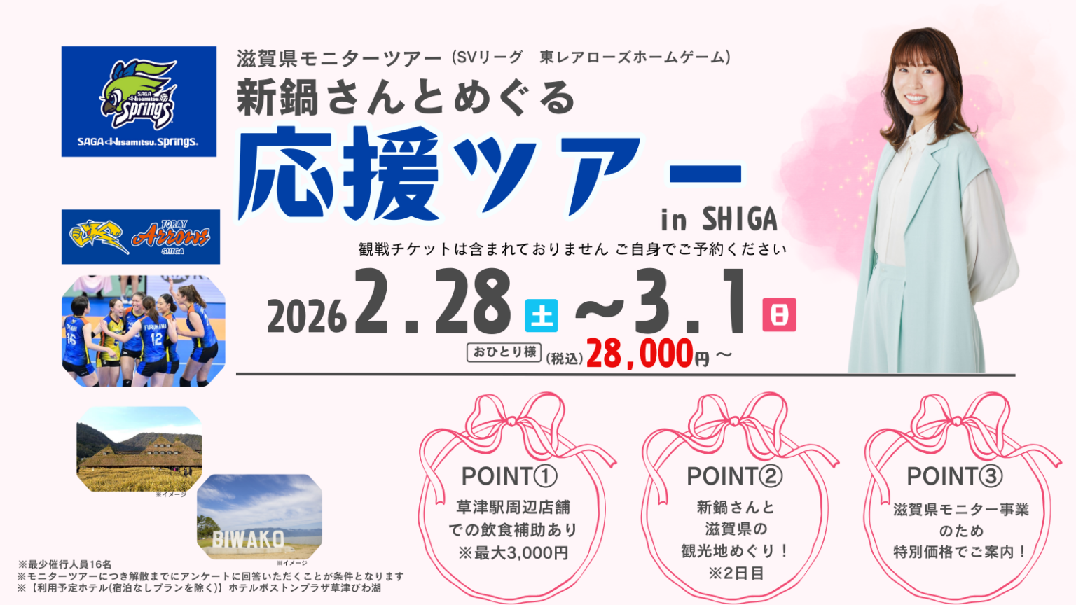 SAGA久光スプリングス所属の新鍋理沙と一緒にSVリーグを応援し、滋賀観光も楽しむ1泊2日のモニターツアーが案内された。京都駅発着で、草津駅周辺の店舗で使える飲食補助は最大3,000円という。