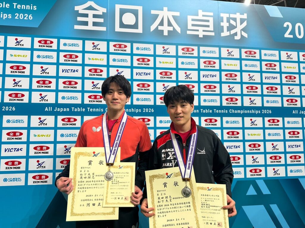 日の出医療福祉グループ(兵庫県加古川市)の実業団卓球チームは、2026年1月29日~2月1日にスカイホール豊田(愛知県)で行われた「全農杯2026年全日本卓球選手権大会(ダブルスの部)」で、英田理志選手と松下大星選手の男子ダブルスペアが準優勝しました。