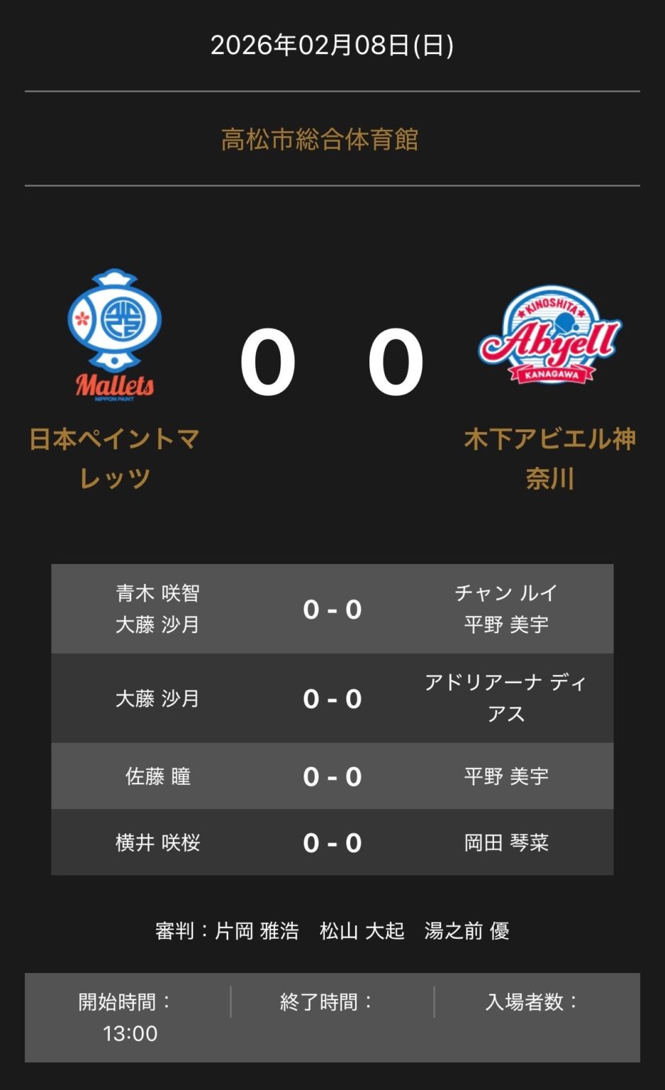 Tリーグは2026年2月8日、ノジマTリーグ2025-2026公式戦「日本ペイントマレッツ vs 木下アビエル神奈川」の対戦オーダーを公表しました。発表時刻は12時09分です。