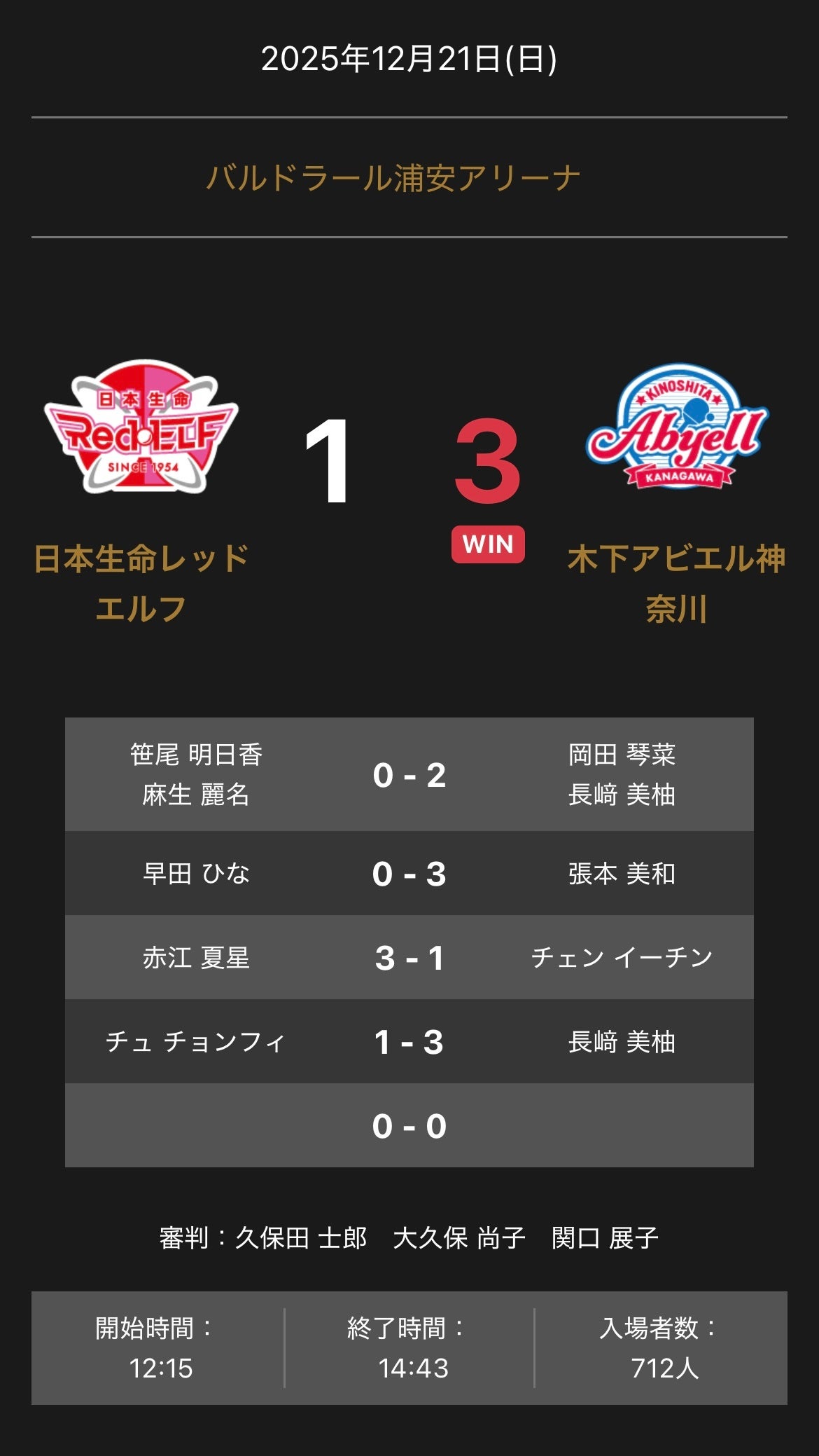 ノジマTリーグ2025-2026シーズンの公式戦が2025年12月21日に行われ、日本生命レッドエルフと木下アビエル神奈川が対戦しました。試合は木下アビエル神奈川が3-1で勝利し、勝ち点を積み上げました。
