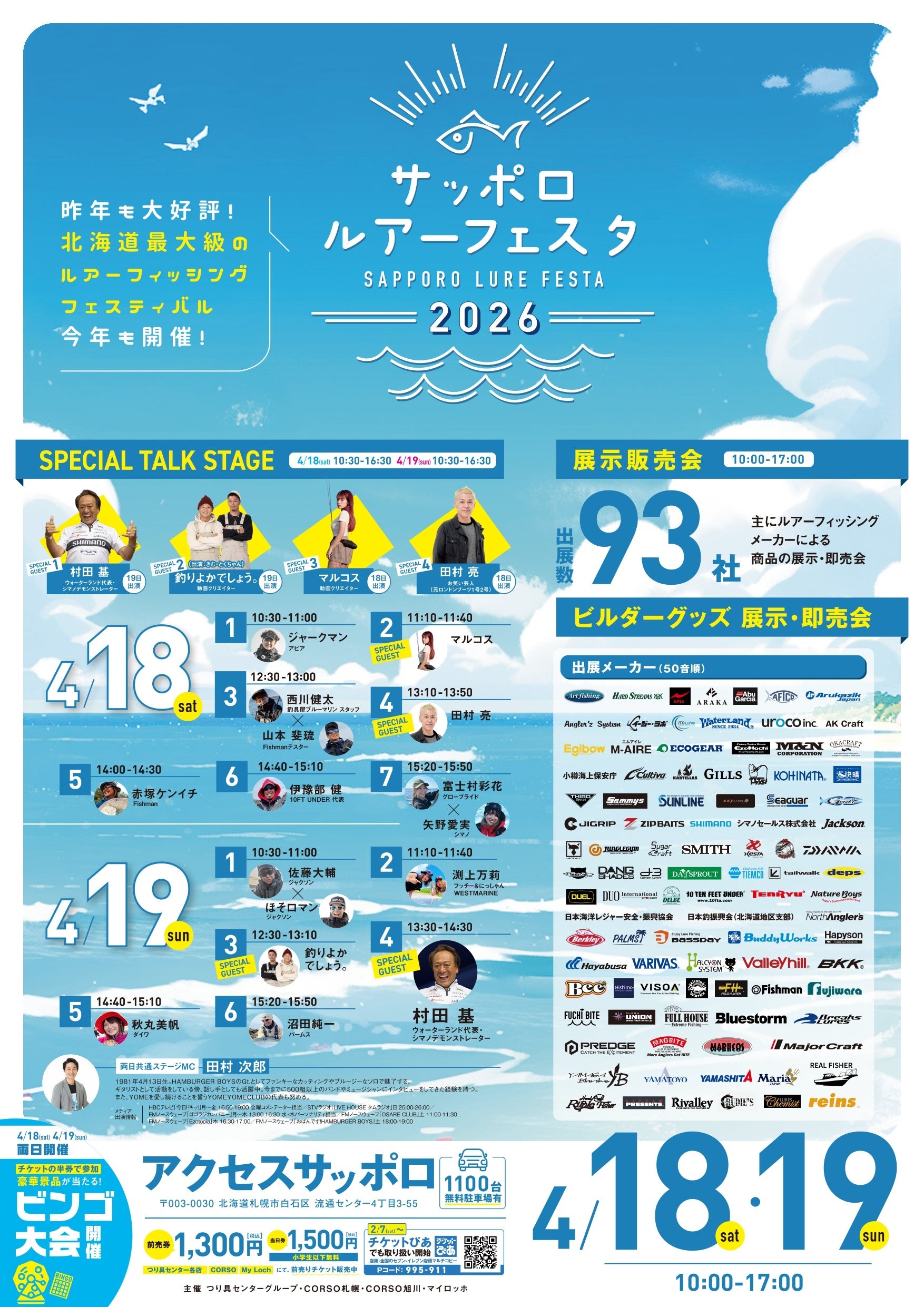 ルアーフィッシングの展示・販売イベント「サッポロ ルアーフェスタ2026」が、2026年4月18日と19日の2日間、アクセスサッポロ(札幌市白石区)で開かれます。出店は全国から93社で、開催時間は両日10:00〜17:00です。入場料は前売り1300円、当日1500円(いずれも税込)で、小学生は無料です。会場には無料駐車場1100台分が用意されます。