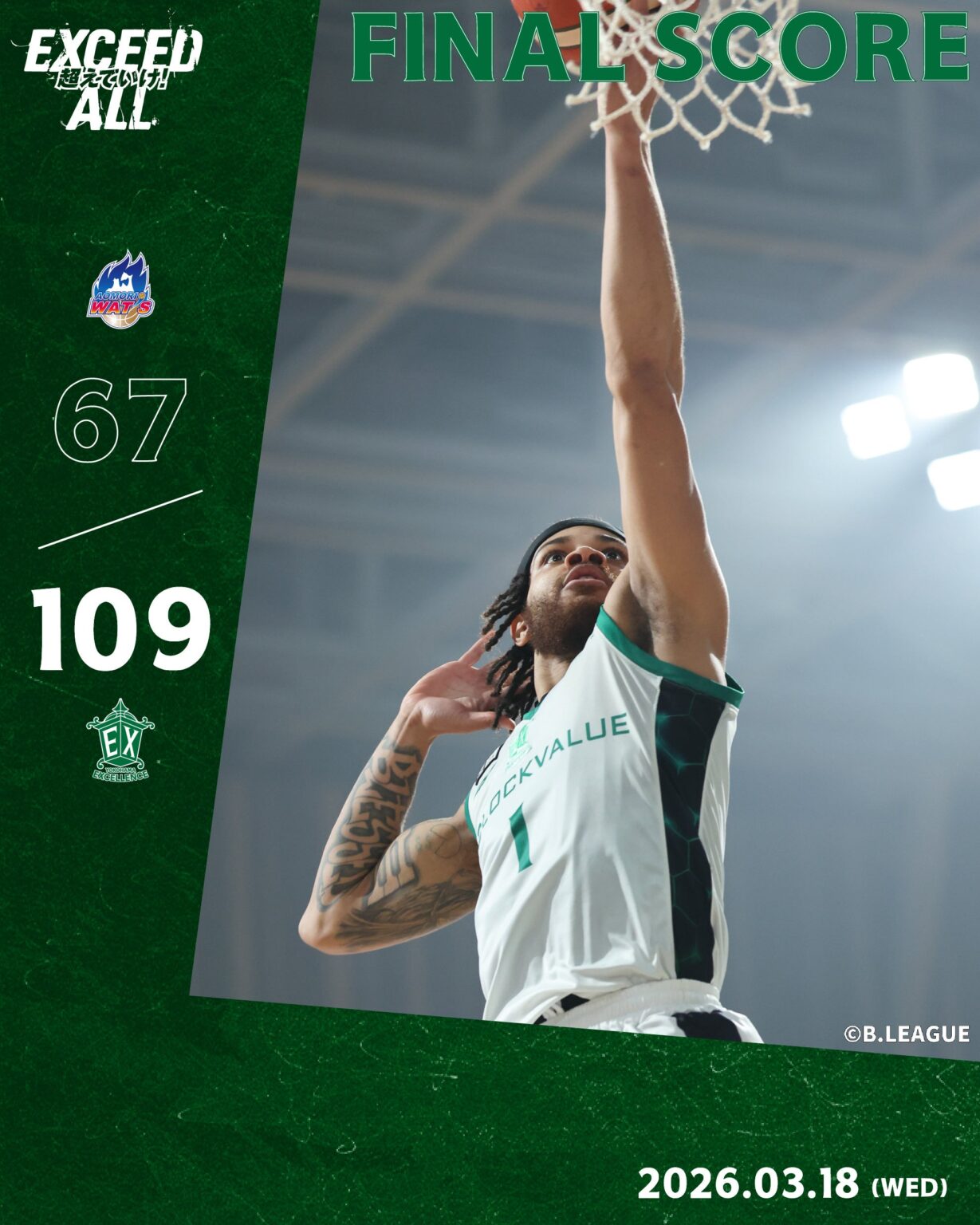 横浜エクセレンスは3月18日、B2第25節の青森ワッツ戦(アウェー)で109-67と大勝しました。1Qを37-22、前半を60-36、3Q終了時点で91-51とリードを広げ、終盤戦の1勝を積み上げました。