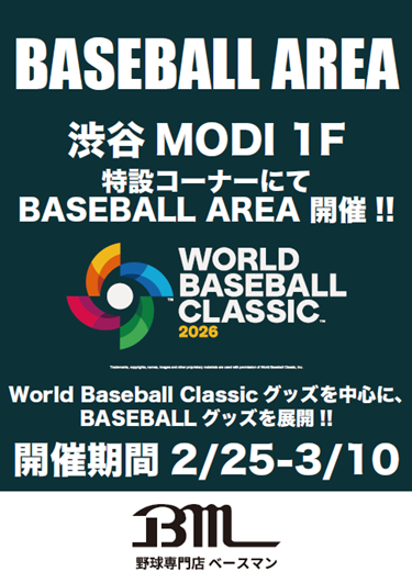 野球用品専門店「ベースマン」は、期間限定ポップアップ「BASEBALL AREA」を渋谷MODI1階に開設します。開催は2026年2月25日から3月10日までで、営業時間は11時〜20時、入場料は無料です。WBC公式グッズの販売に加え、WBC出場選手が使用したバットやグラブなどを展示します(レプリカを含む)。
