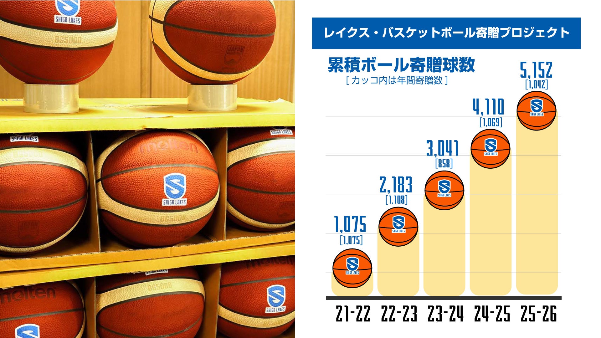 プロバスケットボールクラブ「滋賀レイクス」を運営する滋賀レイクスターズは3月23日、県内企業・事業所と進める「レイクス・バスケットボール寄贈プロジェクト」で、滋賀県内の学校へ寄贈したバスケットボールが累計5,000球に到達したと明らかにしました(2026年3月時点)。