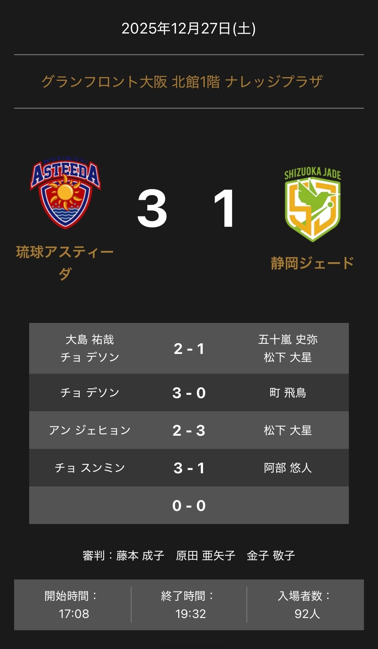 ノジマTリーグ2025-2026シーズンの公式戦が12月27日に行われ、琉球アスティーダが静岡ジェードに3-1で勝利しました。発表元は一般社団法人Tリーグで、同日の試合結果として公表されています。