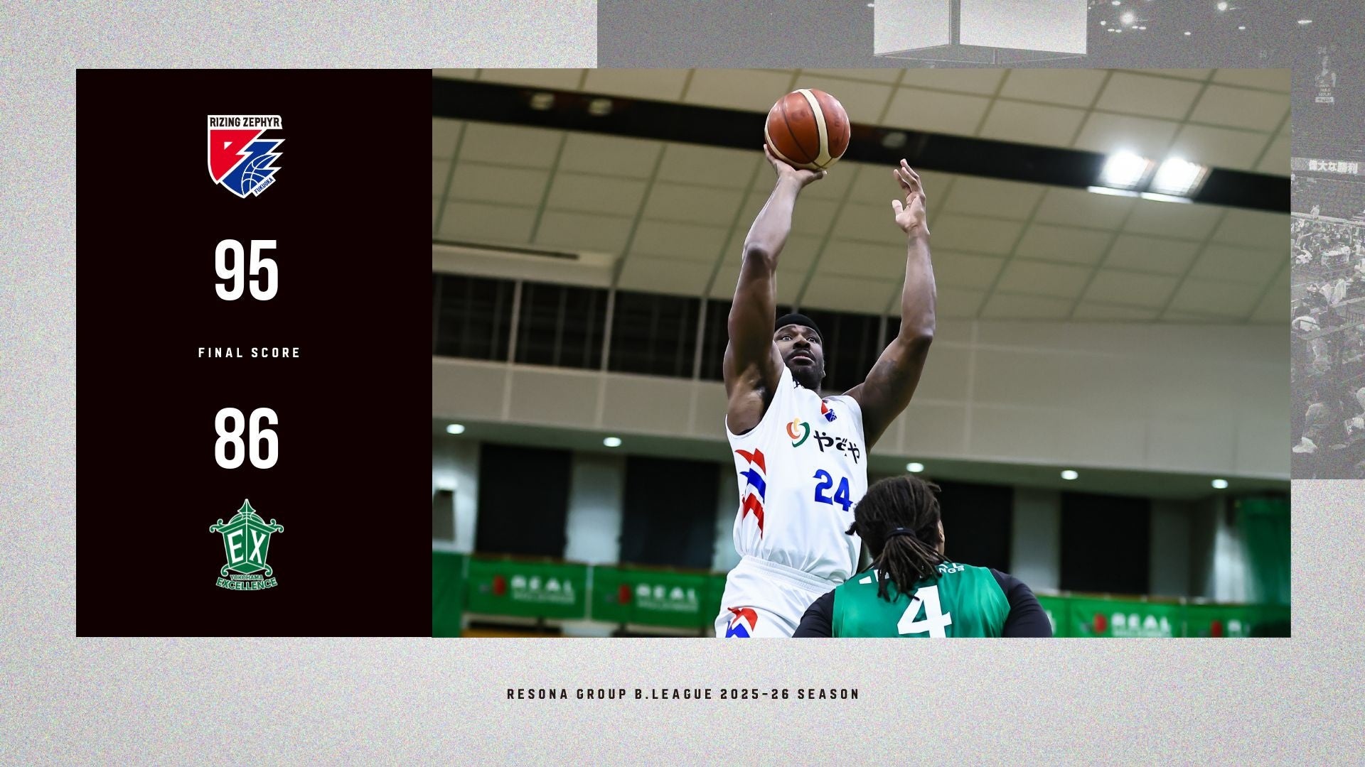 ライジングゼファーフクオカは2026年3月13日(金)22時25分、りそなグループ B.LEAGUE 2025-26シーズンの横浜エクセレンス戦(GAME2)で95-86と勝利し、前日の敗戦から連敗を回避しました。