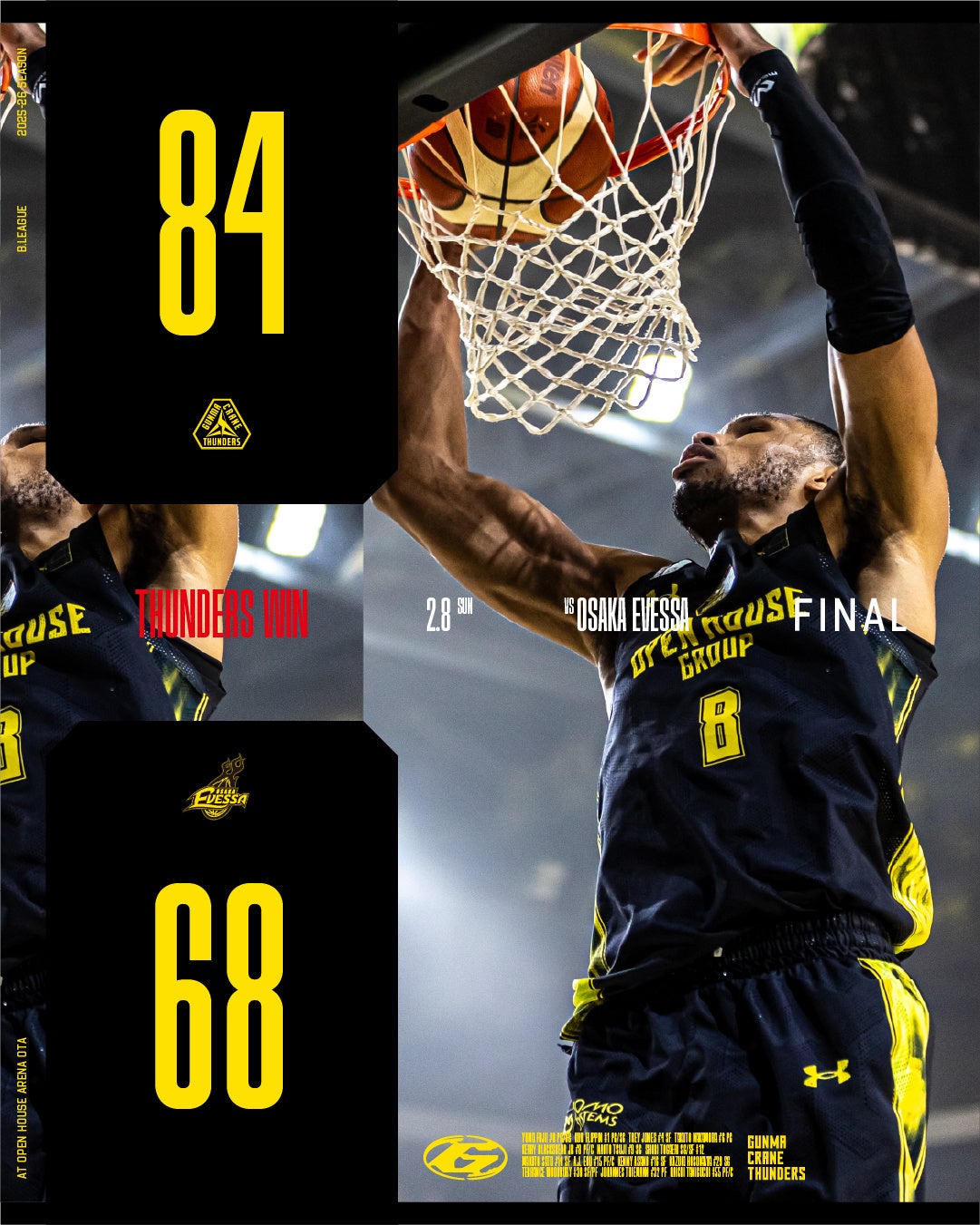 群馬クレインサンダーズは2026年2月8日、りそなグループB.LEAGUE 2025-26シーズンの大阪エヴェッサ戦で勝利し、試合結果とコメント、主なスタッツを公表しました。#8ケリー・ブラックシアー・ジュニアは28得点、2P10/13、FT8/8、10リバウンドを記録しました。