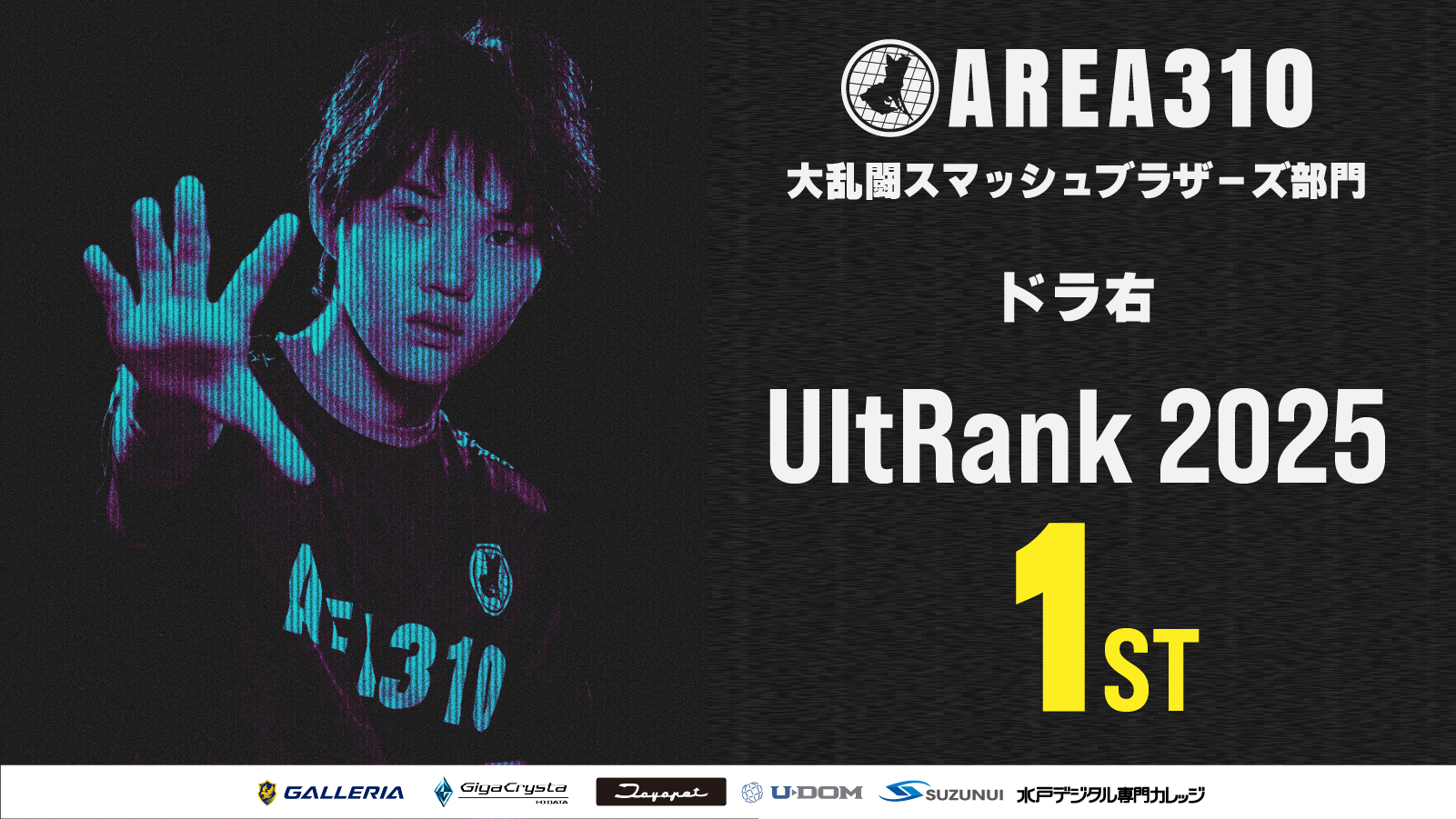 茨城県を拠点とするeスポーツチーム「AREA310」のスマブラ部門に所属するドラ右選手(16歳、兵庫県出身)が、スマブラ競技シーンの世界ランキング「UltRank」で2025年の年間世界1位を獲得しました。UltRankは世界各地のオフライン大会成績をもとに算出されます。