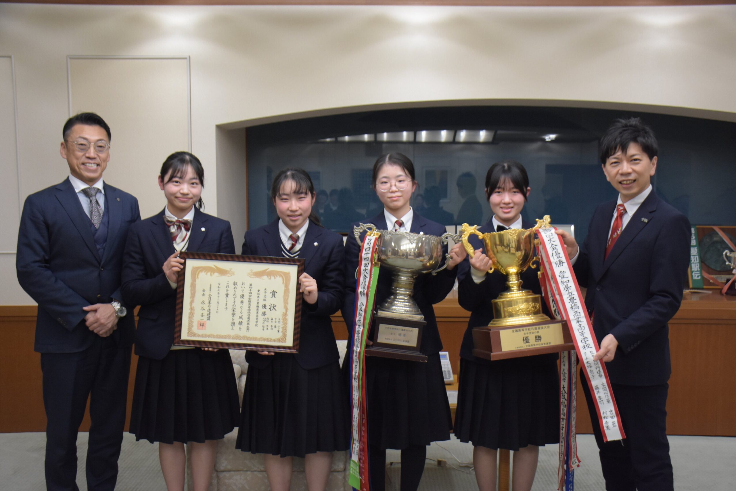 愛知県立豊橋商業高校の弓道部は2026年2月12日、昨年12月23~25日に静岡県藤枝市で開かれた「第44回全国高等学校弓道選抜大会」で女子団体優勝(創部71年目で初)を果たしたとして、豊橋市の長坂尚登市長に報告しました。