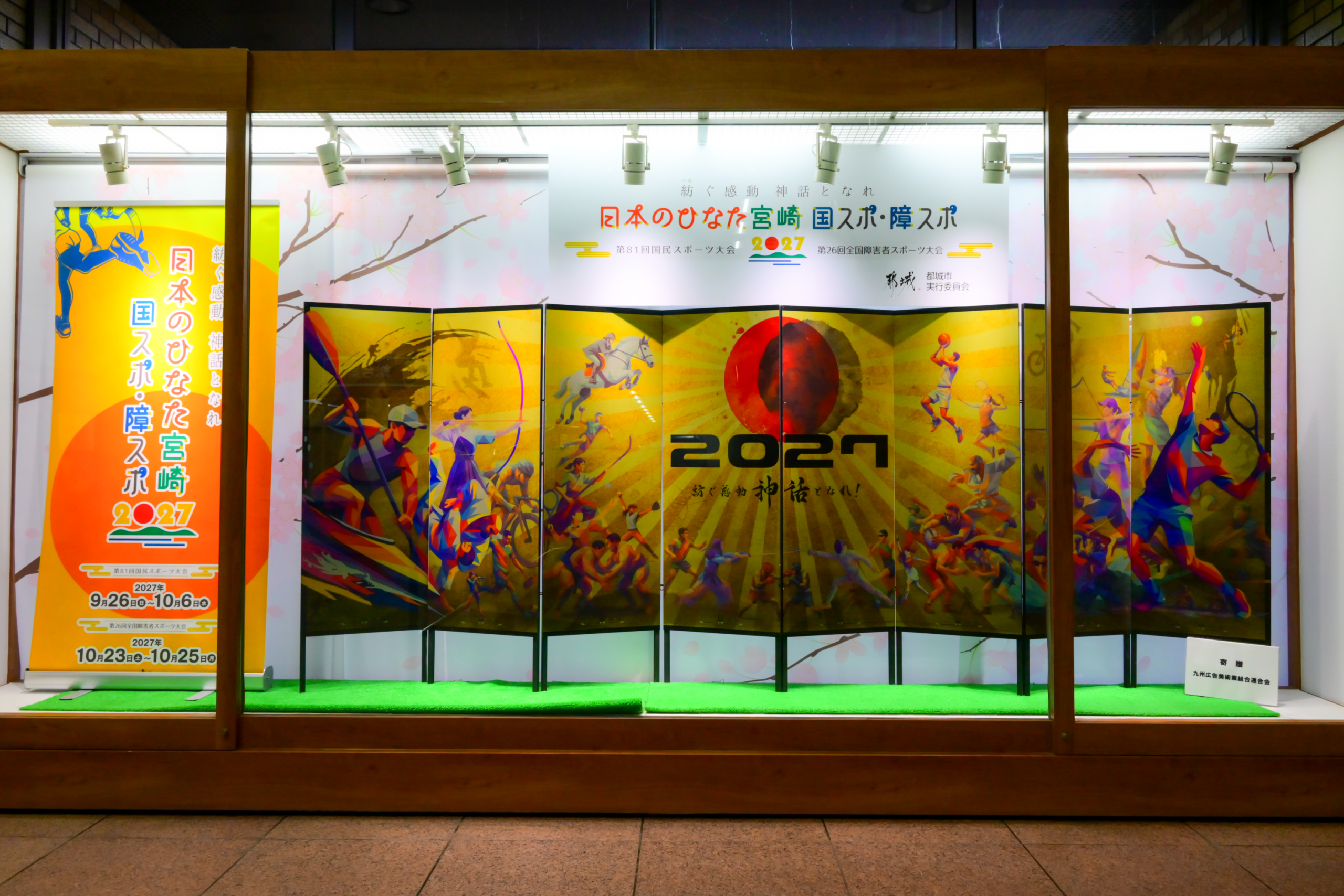 宮崎県都城市は、2027年開催予定の「日本のひなた宮崎 国スポ・障スポ」をテーマに制作された広告美術作品を、市役所1階ロビーなど市内各所で展示しています。都城市役所では、各競技のイラストを配した金の屏風を思わせる大型看板をPRブースとして設置し、来庁者に大会開催を呼びかけています。