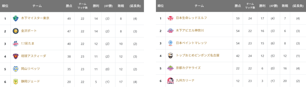 次回は札幌開催で上位勢の直接対決を含み、勝点の積み上げ次第で首位が入れ替わる可能性があります。男子は岡山の残り試合の結果がプレーオフ進出争いの行方を左右しそうです。