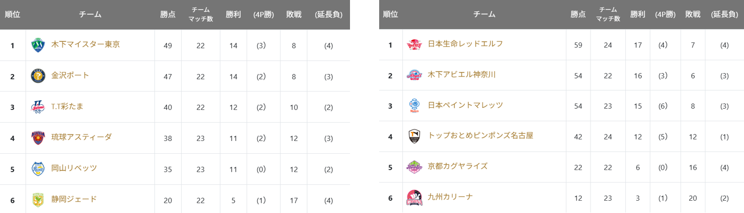 女子はトップおとめピンポンズ名古屋が京都カグヤライズに4-0、九州カリーナに3-1で連勝し、順位4位を維持しました。今季成績は10勝12敗で、勝ち越しには残り3戦の全勝が必要です。日本生命レッドエルフは日本ペイントマレッツに3-2、木下アビエル神奈川に3-1で勝利し、上位争いを押し上げました。