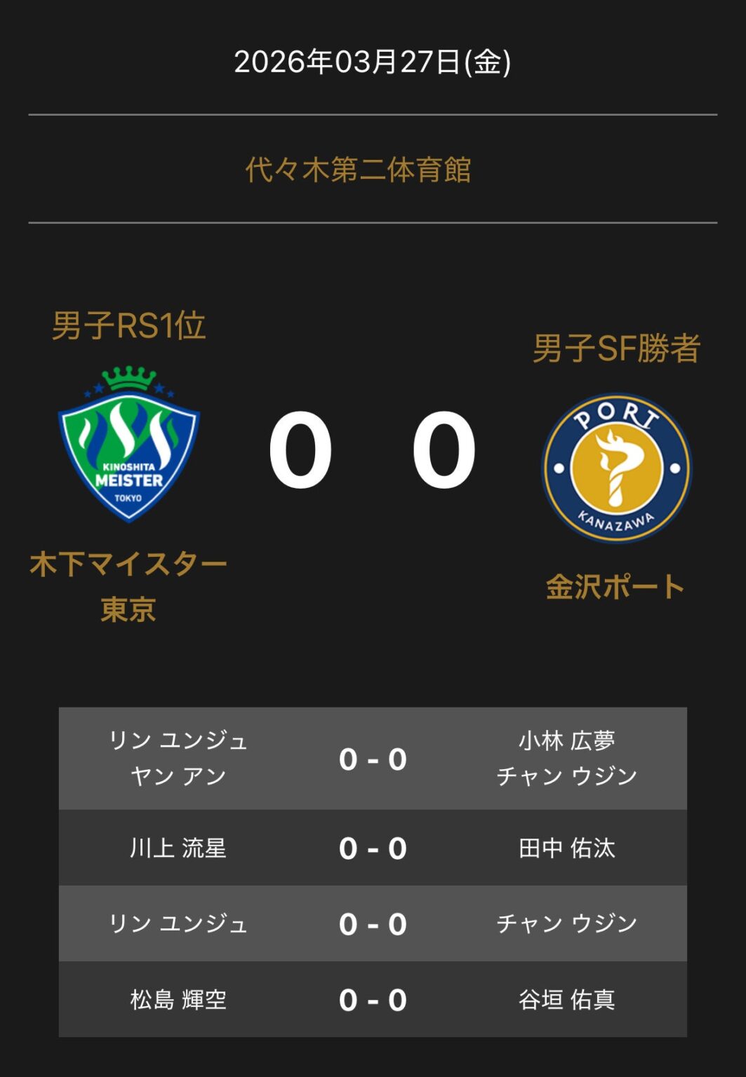 ノジマTリーグ 2025-2026シーズン プレーオフ 男子ファイナル 3月27日(金) 開催 木下マイスター東京 vs 金沢ポート 対戦オーダー発表