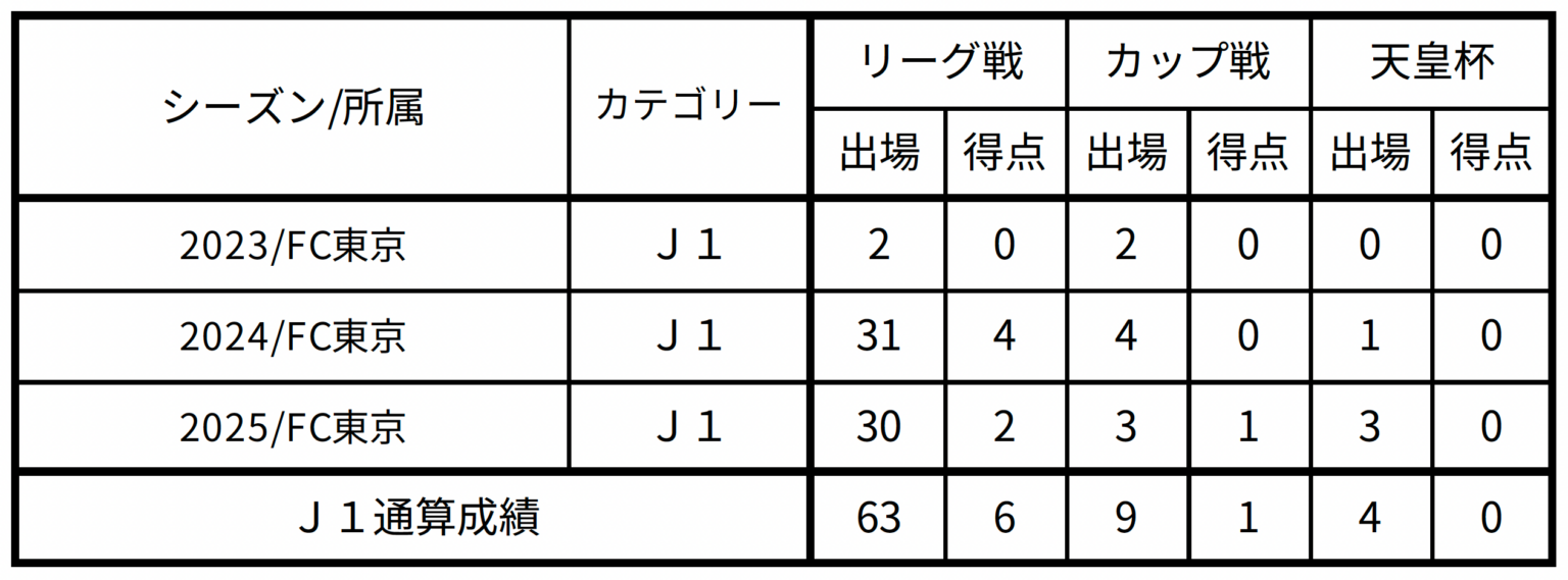 安斎選手は身長175cm、体重68kg。東京都目黒区出身で、FC東京の下部組織や青森山田高校、早稲田大学を経て、2024年からFC東京に在籍しています。出場記録の詳細な数値は今回の発表時点では示されていません。