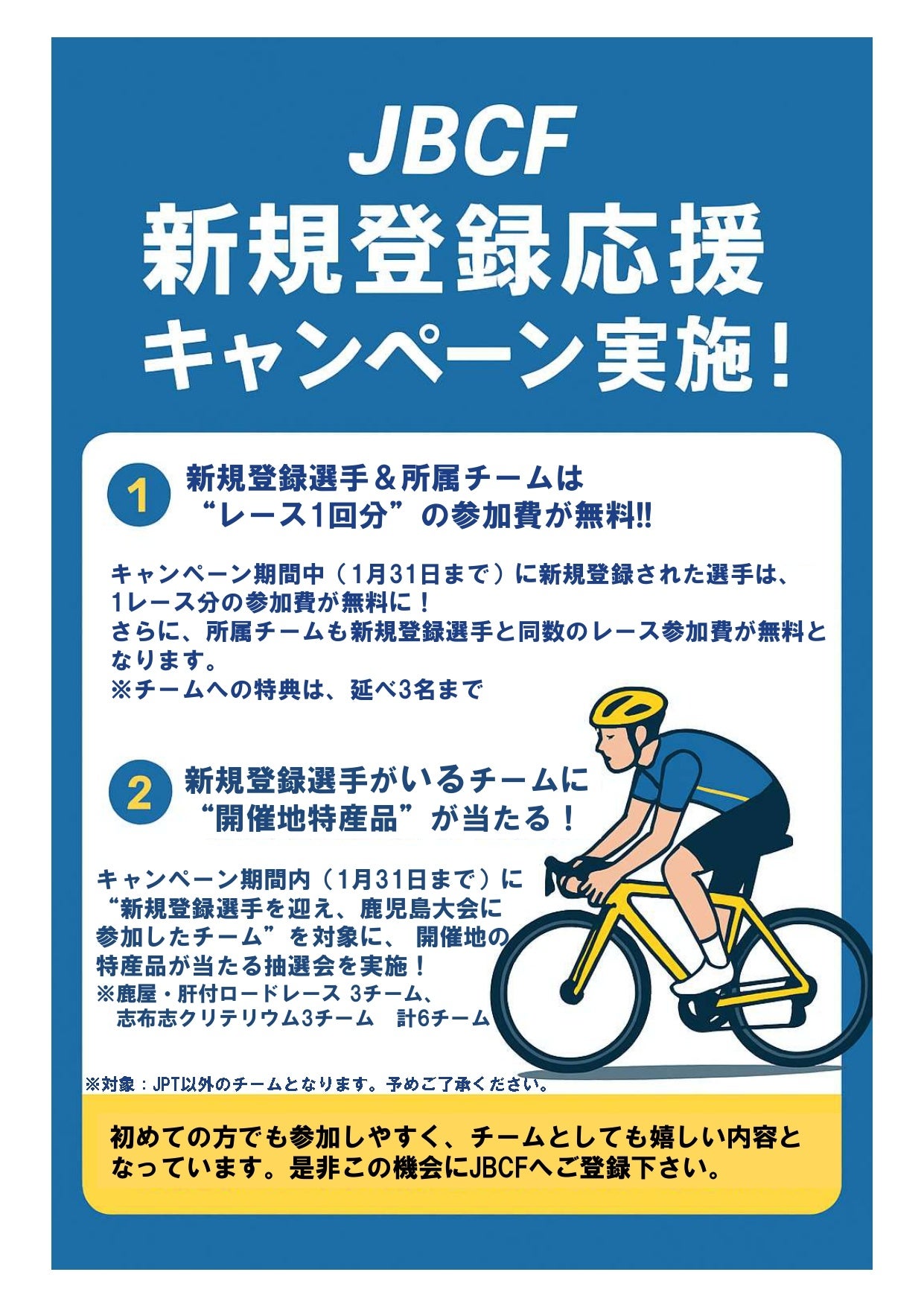 JBCF(全日本実業団自転車競技連盟)は、2026年の加盟登録で新規登録者を対象にした応援キャンペーンを2026年1月15日〜1月31日に実施します。期間内に新規登録した選手はレース1回分の参加費が無料となり、所属チームも新規登録選手と同数の参加費が無料になります(チーム特典は延べ3名まで)。さらに、期間中に新規登録選手を迎えて鹿児島大会に参加したチームを対象に、開催地の特産品が当たる抽選も行われます。抽選対象は鹿屋・肝付ロードレース3チーム、志布志クリテリウム3チームの計6チームです。対象はJPT以外のチームで、詳細は公式サイトで案内するとしています。今後、費用面のハードルを下げる施策として新規選手の登録動向や大会参加者数への影響が注目されます。