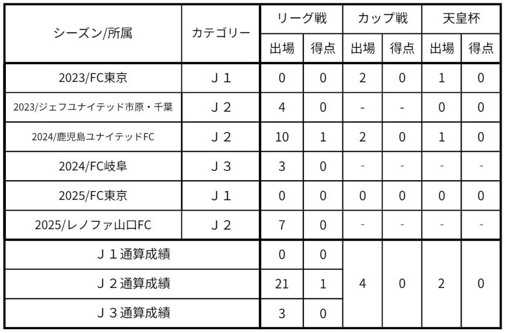 西堂選手は2023年にFC東京へ加入後、ジェフユナイテッド市原・千葉(2023年8月〜2024年1月)、鹿児島ユナイテッドFC(2024年1月〜8月)、FC岐阜(2024年8月〜2025年1月)への期限付き移籍を経て、2025年8月からレノファ山口FCでプレーしていました。代表歴はU-16日本代表(2017年)とU-18日本代表(2019年)があります。出場記録は「2025シーズン終了時点」として示されています。