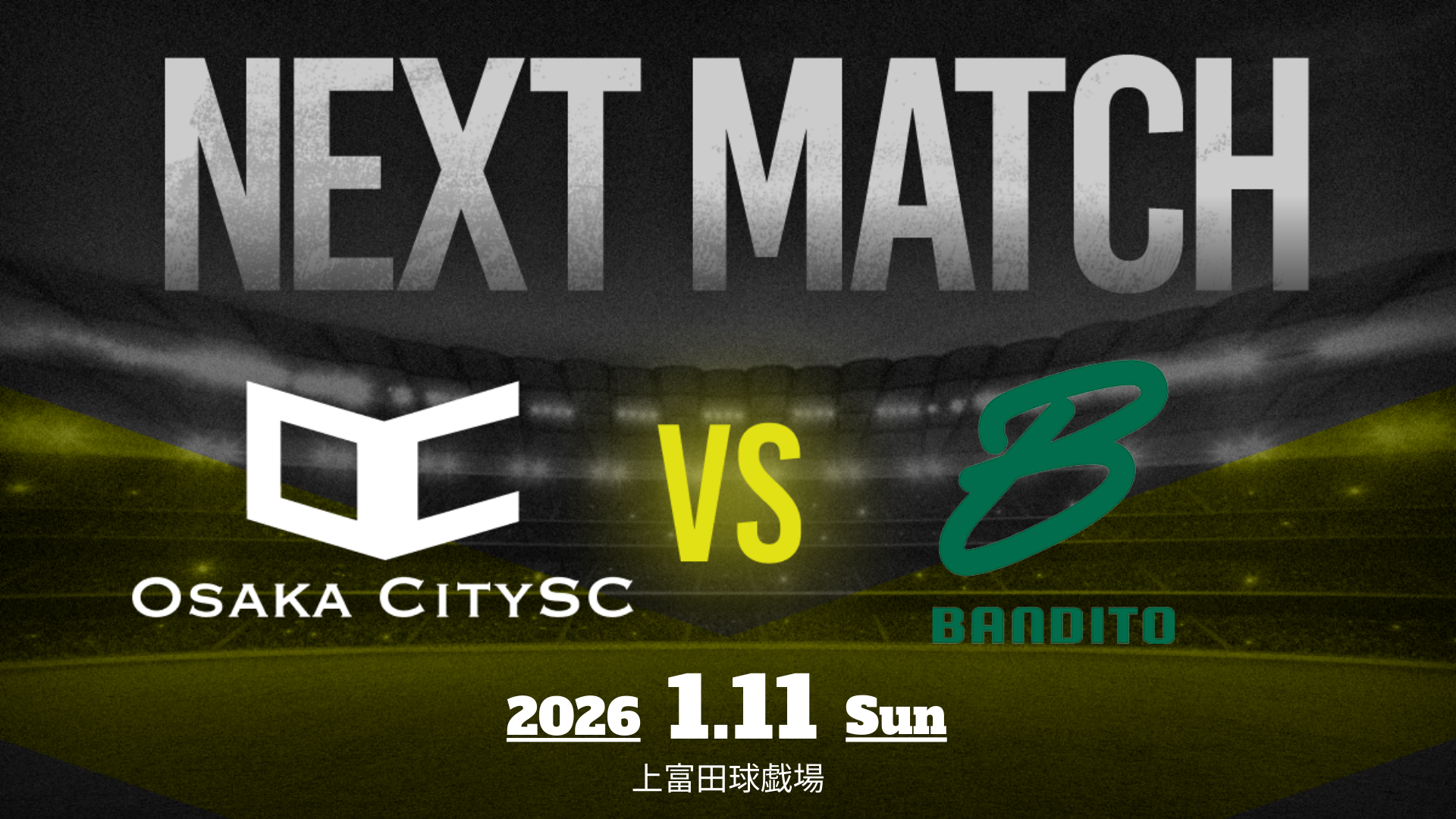 Osaka City SCは2026年1月11日(日)正午、和歌山県の上富田球技場で「第60回 関西府県サッカーリーグ決勝大会」決勝に臨み、奈良県代表のBANDITO生駒と対戦します。勝てば関西2部への昇格が決まる一戦で、試合はYouTubeでリアルタイム配信予定です。