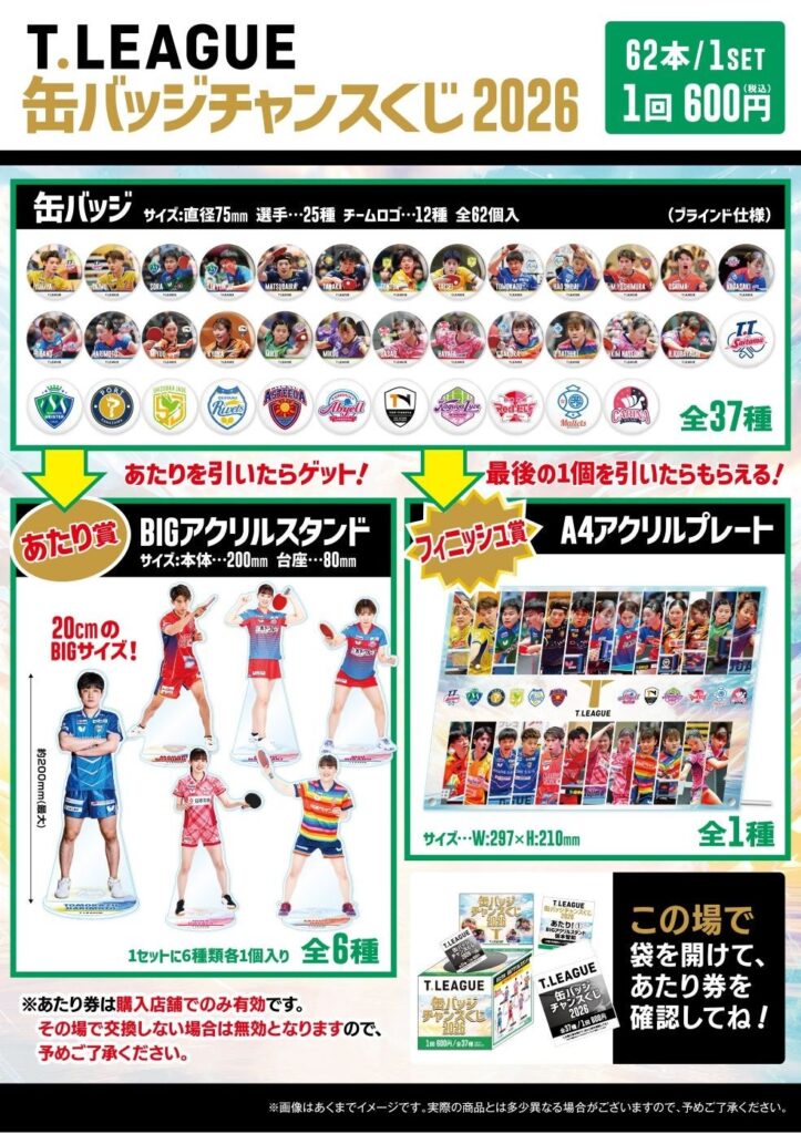 「T.LEAGUE 缶バッジチャンスくじ」発売のお知らせ