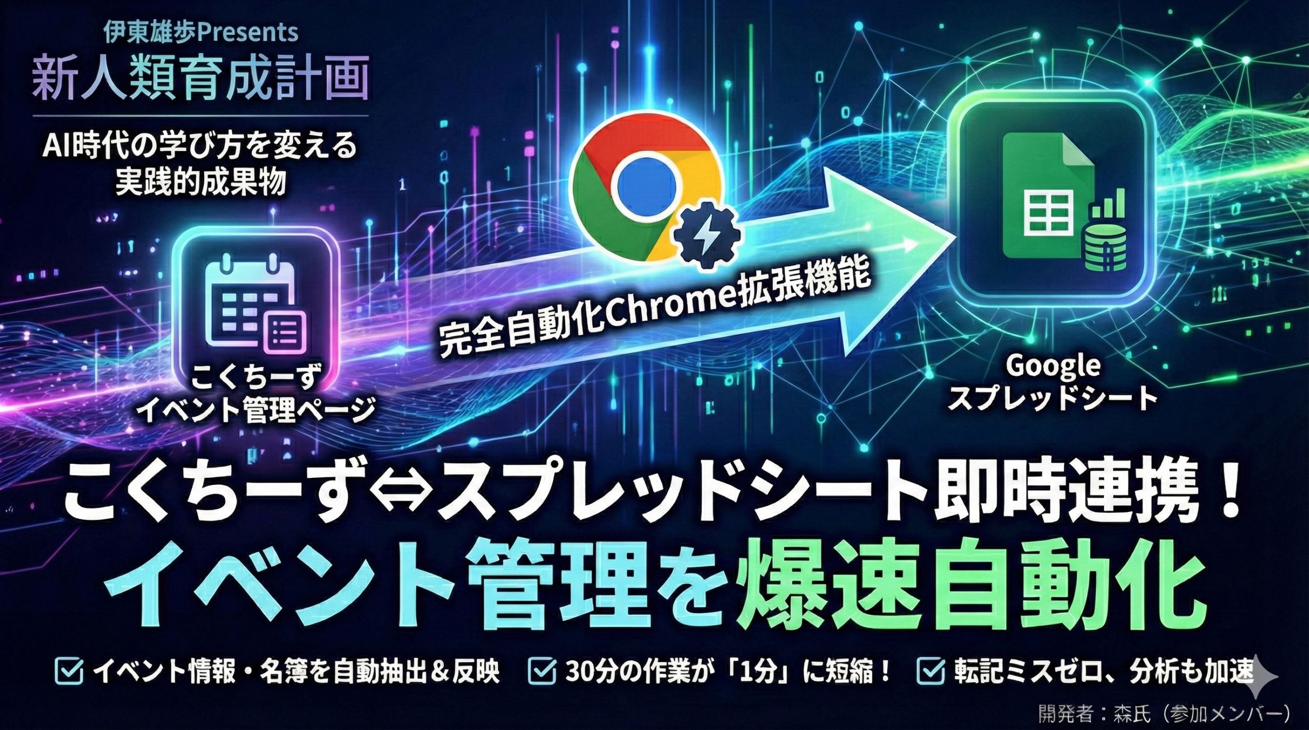 イベント管理サービス「こくちーず」に完全対応したChrome拡張「こくちーず専用|イベント管理オートメーション拡張機能」が公開されました。イベントページを解析してイベント情報・名簿・参加データを自動収集し、Googleスプレッドシートへ反映します。集計や転記に毎回30〜60分かかっていた作業を約1分に短縮し、転記ミスをゼロにすることを目指します。参加率・キャンセル率の計算式も自動生成し、運用の標準化を後押しします。
