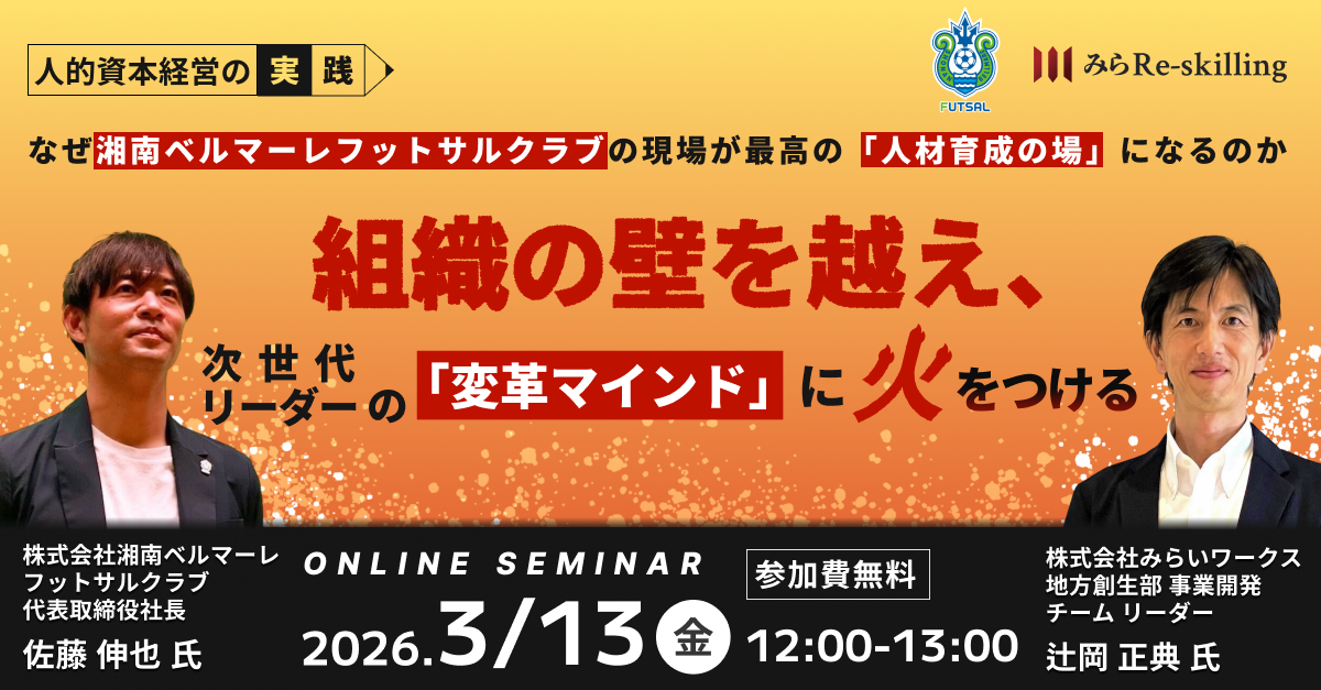 みらいワークス(東京都港区)と湘南ベルマーレフットサルクラブは、次世代リーダーの「変革マインド」をテーマにしたオンラインセミナーを2026年3月13日12時〜13時にZoomウェビナーで開きます。参加費は無料です。