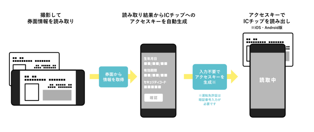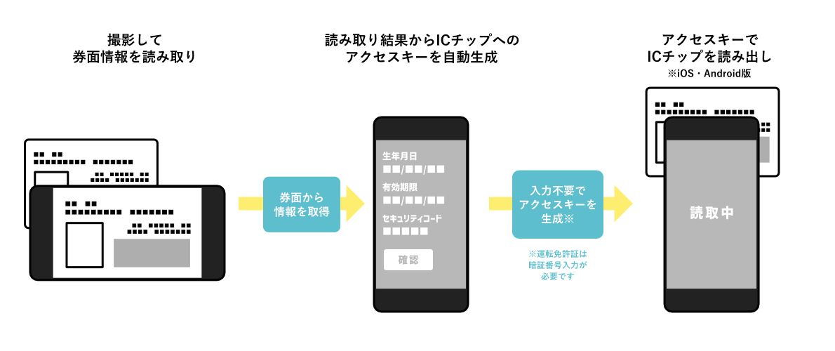 2027年に予定される犯罪収益移転防止法改正では、紙面の目視による真贋判定からICチップ情報の活用へ移行する見通しです。同社のライブラリは、運転免許証・マイナンバーカード・在留カード・パスポートを撮影するだけで券面情報を文字化し、その結果からアクセスキーを自動生成してICチップを読み出します。マイナンバーカードではカメラ画像から照合番号Bを自動生成し、暗証番号入力が必要な運転免許証にも対応します。