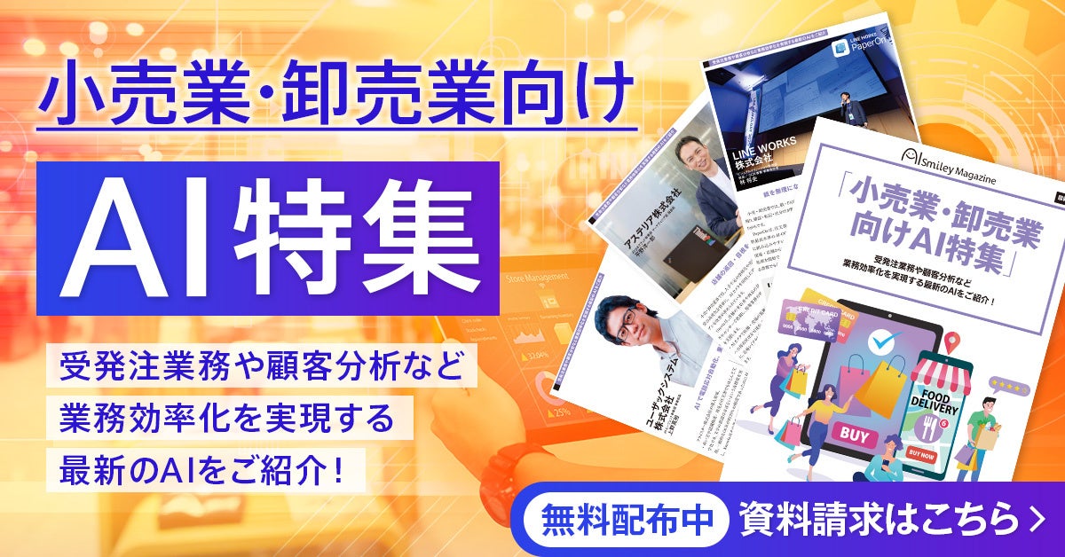 AIポータル「AIsmiley」を運営するアイスマイリー(東京都渋谷区)は2026年1月26日、WEB雑誌「小売業・卸売業向けAI特集」を公開した。受発注業務や顧客分析などの効率化につながる最新AIを取り上げ、関連するAI提供企業5社を紹介する。
