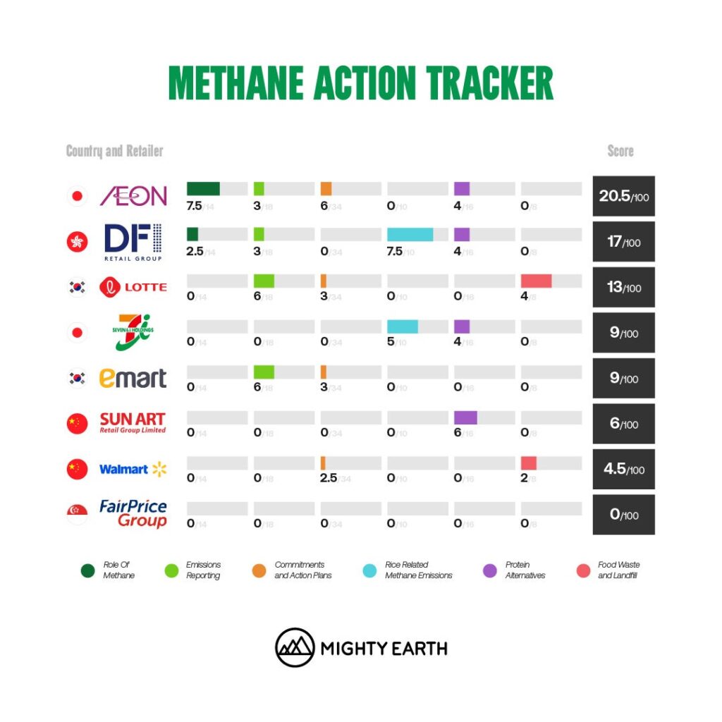 世界的な環境保護団体マイティー・アースは2026年3月19日、アジアの大手スーパーマーケット8社の気候変動対策を、メタン削減と情報開示の観点から評価したランキング(スコアカード)を公表し、日本のイオンが100点満点中20.5点で首位となりました。セブン&アイ・ホールディングスは9点で4位でした。