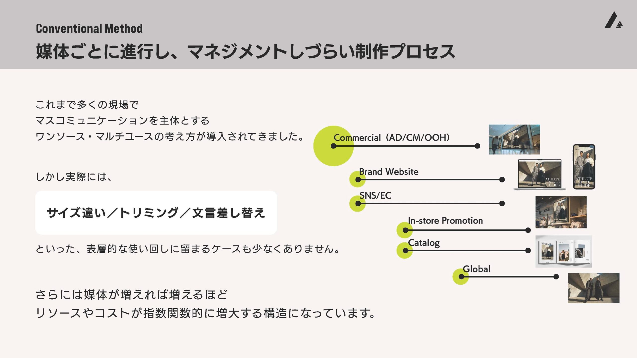 また、チャネル多様化で媒体ごとに制作体制が分断され、手戻りや表現のブレ、コスト増が起きやすい課題に対応する狙いだ。「Image to Multichannel」では、コアビジュアルを起点に媒体特性や利用シーンに合わせて表現を展開し、一貫性を保ちながら迅速に適応させる設計とする。背景には年間10,000件の案件で蓄積した知見があるという。