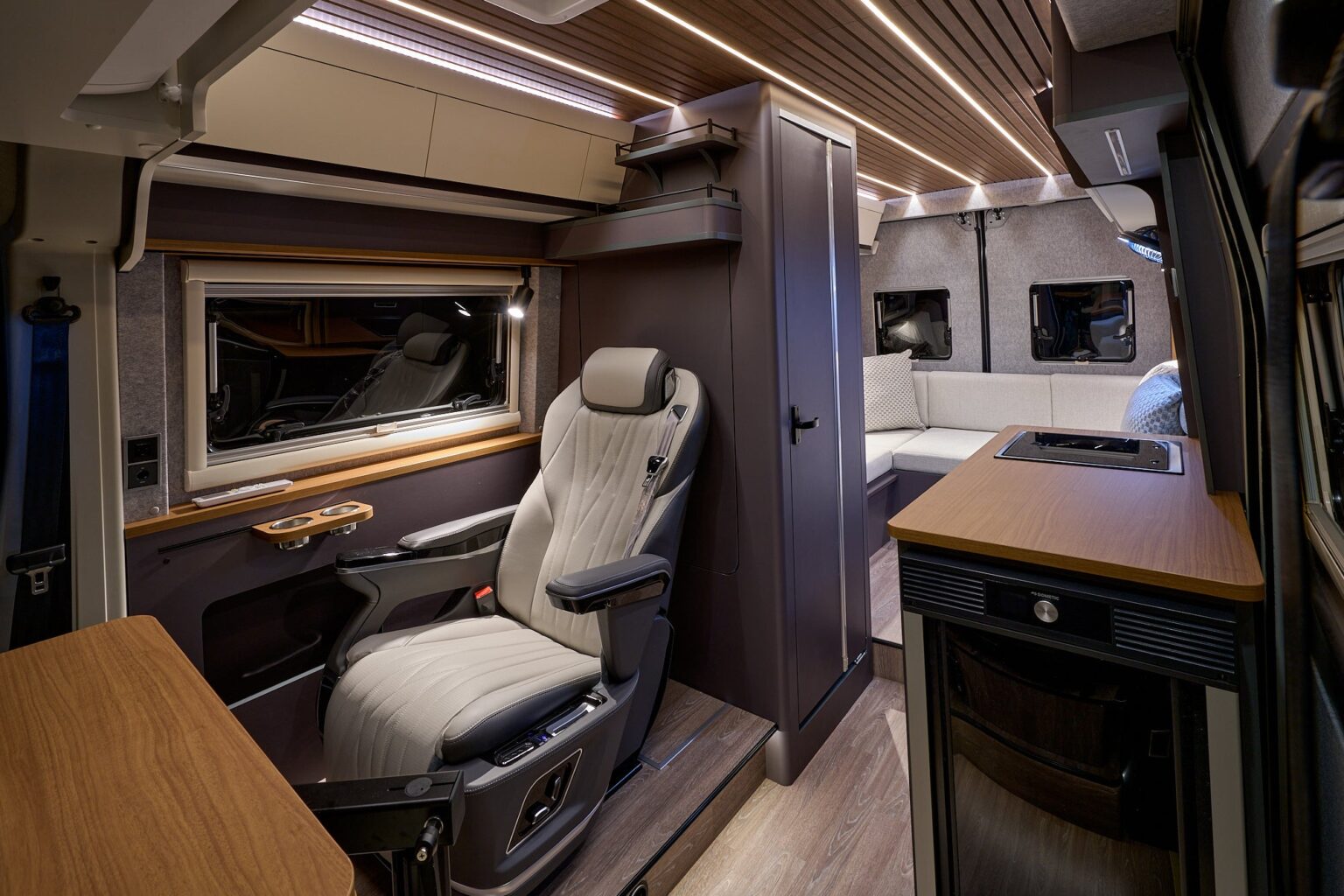 内装ではセカンドシートを1名用キャプテンシートとし、電動マッサージチェアを搭載。背後にマルチルームを配置し、素材や配色も欧州車を想起させる上質な空間に仕上げたという。