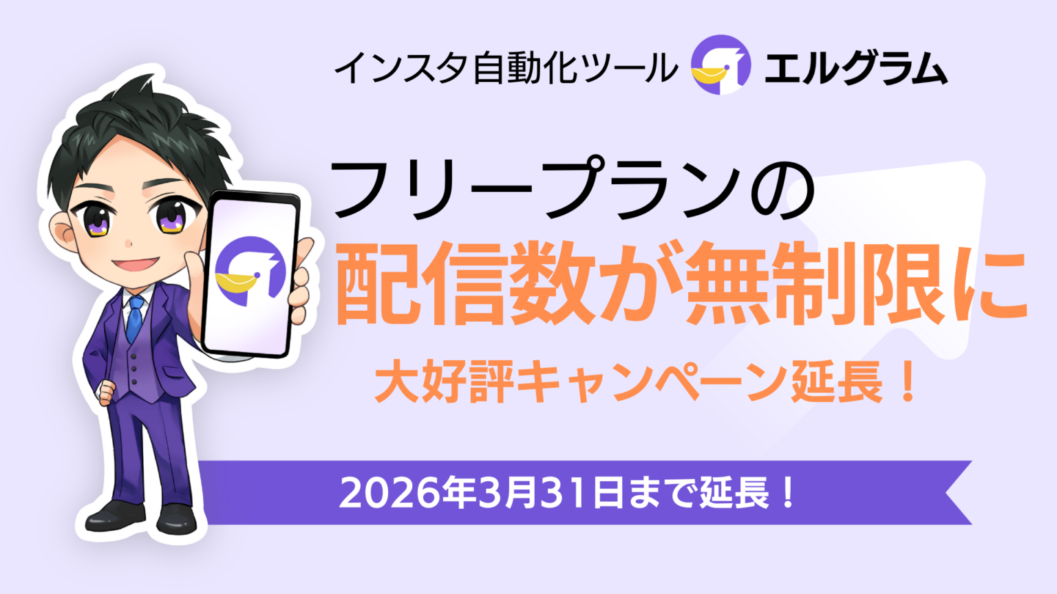 インスタグラム自動化ツール「エルグラム」は、フリープランの月間配信数を無制限で使えるキャンペーンを2026年3月31日まで延長します。通常は月1,000通が上限で、2026年4月以降は1,000通へ戻る予定です。運営は株式会社ミショナ(福岡市)です。
