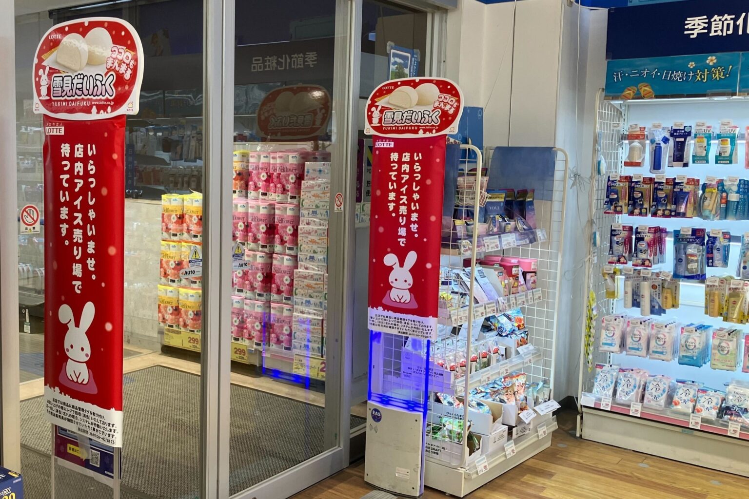 施策の舞台は、来店者が必ず通過する防犯ゲートを広告面にした「インパクトゲート®」です。雪見だいふくの世界観を反映したオリジナル装飾を掲出し、「いらっしゃいませ。店内アイス売り場で待っています。」というコピーで売り場を名指しして冷凍ケースへ誘導します。雪見だいふくは発売44周年のブランドです。