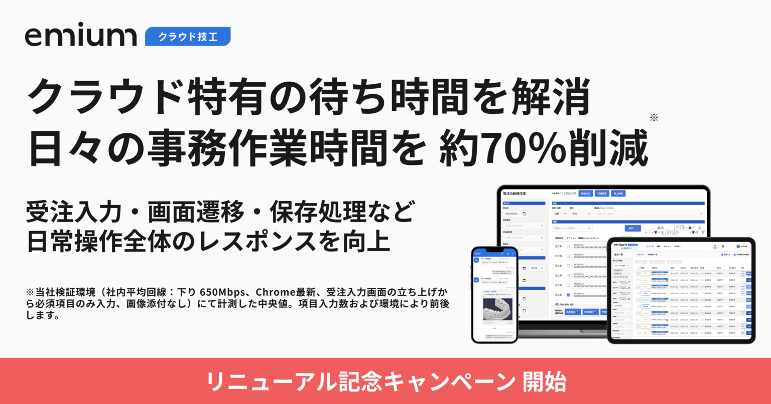 東京科学大学発ベンチャーのエミウム(東京都新宿区)は2026年1月7日、歯科技工所・歯科医院向けクラウド「エミウム クラウド技工」を大幅リニューアルしました。操作レスポンスを高め、受注入力の入力完了までの時間を従来約30秒から約10秒へ短縮したとしています(同社検証環境の中央値)。導入前準備の負担を減らす「標準マスタ提供サービス」も始めました。