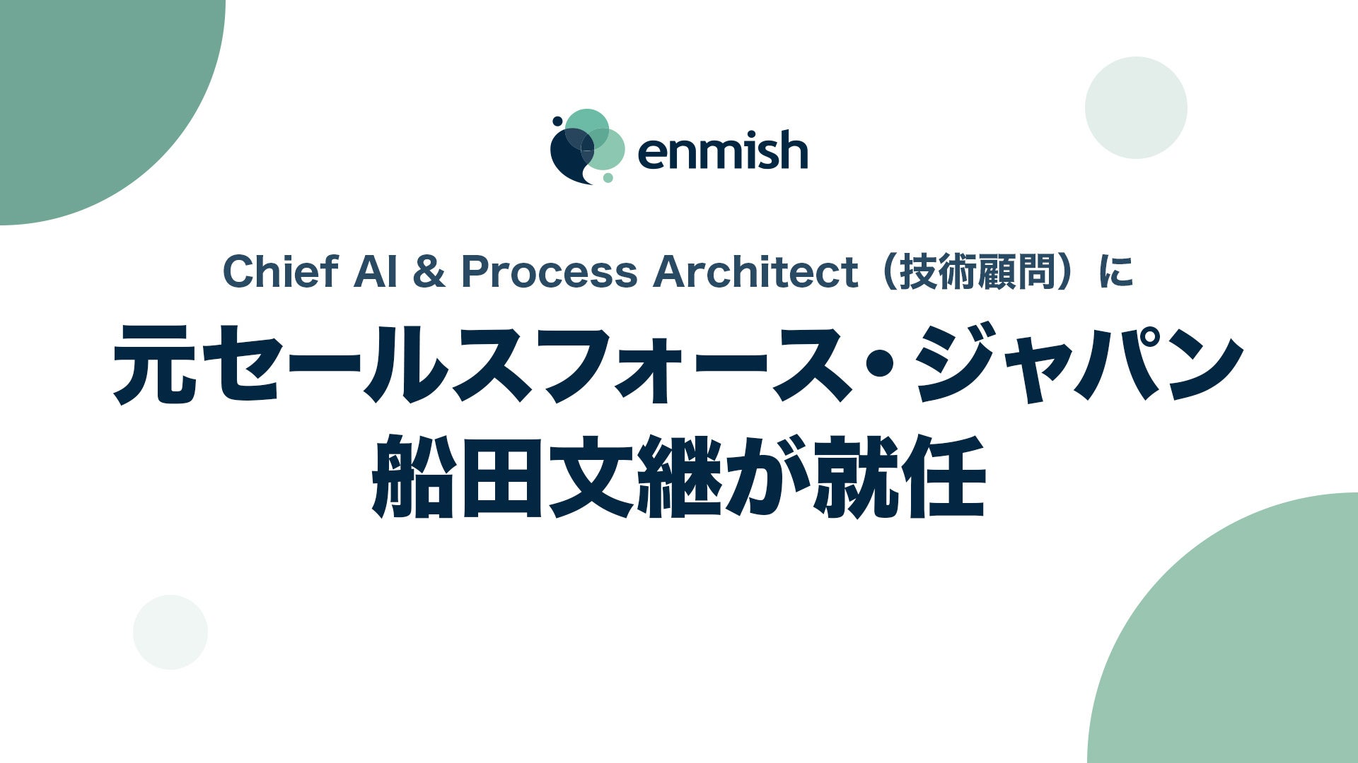 株式会社エンミッシュ(東京都渋谷区)は2月1日付けで、元セールスフォース・ジャパンの船田文継氏がChief AI & Process Architect(技術顧問)に就任したと明らかにしました。事業拡大に合わせ、AI導入とSalesforce活用の高度化を進める狙いです。