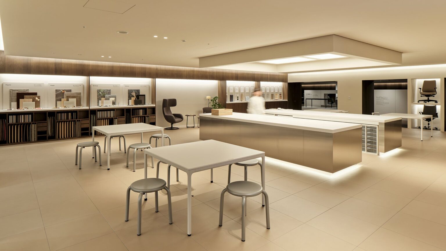 展示は「サステナブル」と「知る人ぞ知る」を軸に素材を独自基準でセレクトします。大判サンプルを比較できるほか、照明の色温度を3000K〜5000Kまで500K刻みで変え、見え方の差を検討できる設備を用意します。テーブル上で素材の組み合わせを試せる環境も整え、意思決定を支援します。