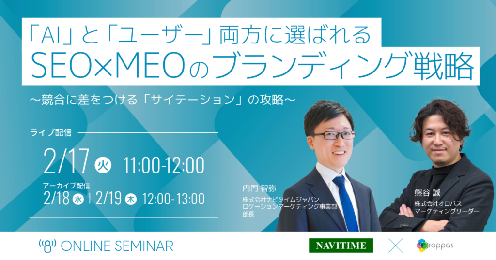 株式会社オロパス(札幌市)と株式会社ナビタイムジャパンは、オンラインウェビナー「『AI』と『ユーザー』両方に選ばれる SEO×MEOのブランディング戦略」を2026年2月17日にライブ配信し、2月18日と19日にアーカイブ配信します。参加費は無料です。