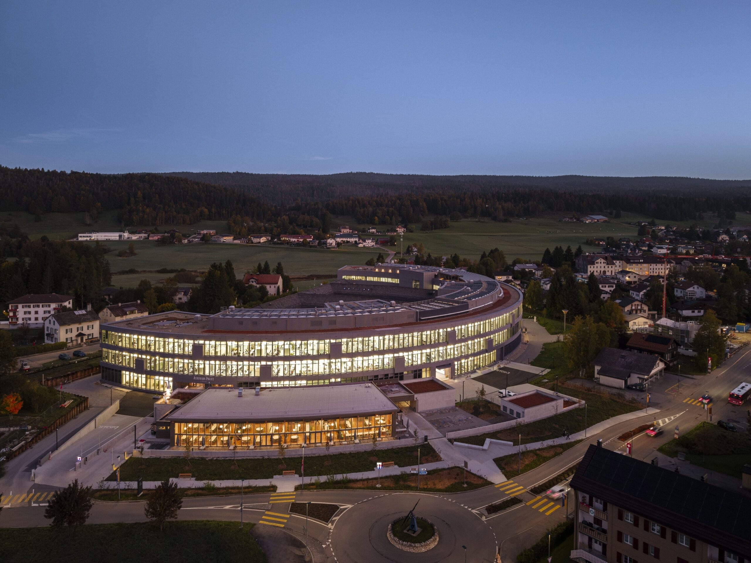 建物は柔軟性や快適性、サステナビリティを重視して設計され、長さ321mの電気調光ガラスファサードを採用しました。屋上緑化に加え、建物周囲に高さ80cmの壁を設けて排水を誘導し、洪水リスクを抑えるとしています。環境性能では、建築の環境認証であるMinergie-ECO®を取得しました。
