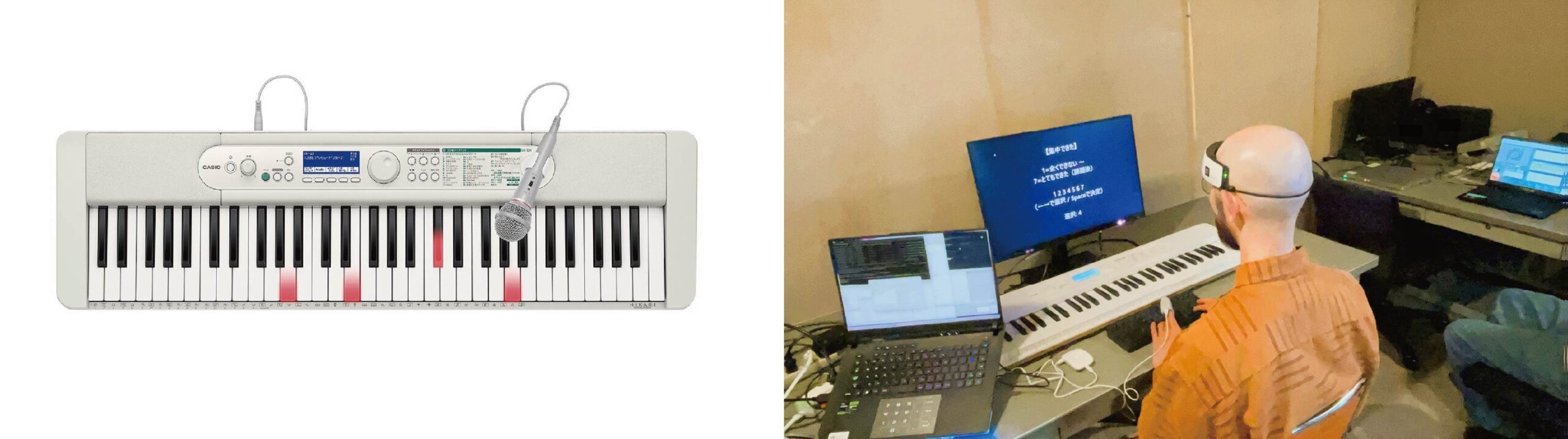 実験では光ナビゲーションキーボード「LK-530」を用い、テンポの異なるクラシック曲(BPM150、BPM60)などを聴いた状態で短期記憶などの認知課題を実施しました。脳血流を測るNIRS(近赤外分光法)に加え、心拍センサー、アイトラッカーで作業効率、脳活動パターン、心拍変動、瞳孔反応を測定しました。