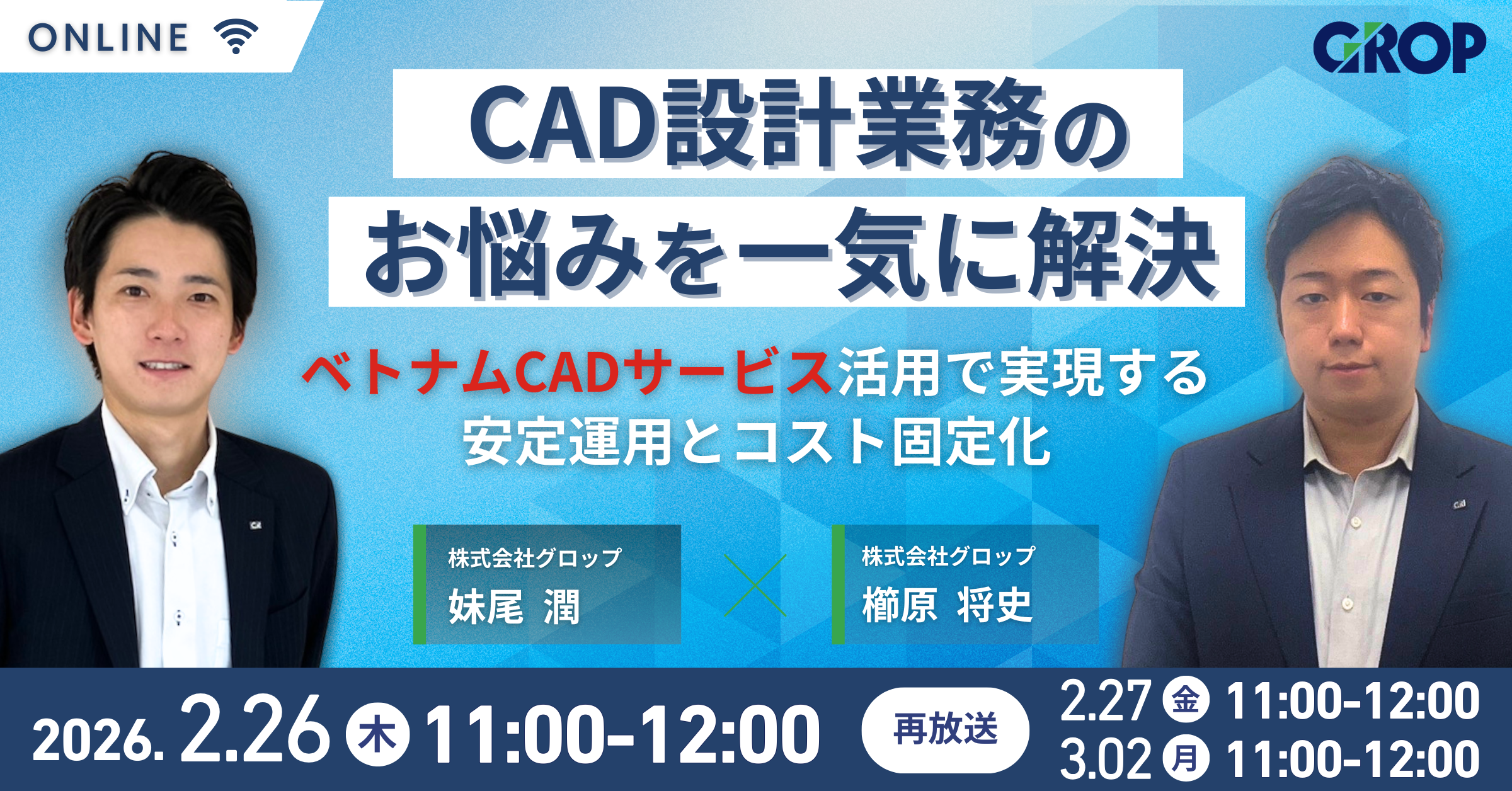 グロップ(岡山県岡山市)は、CAD設計業務の外部活用をテーマにしたWebセミナーを2026年2月26日11時〜12時にLIVE配信します。参加費は無料で、申込み後に届くメール内URLから参加できます。アーカイブ配信は2月27日と3月2日の各11時〜12時です。
