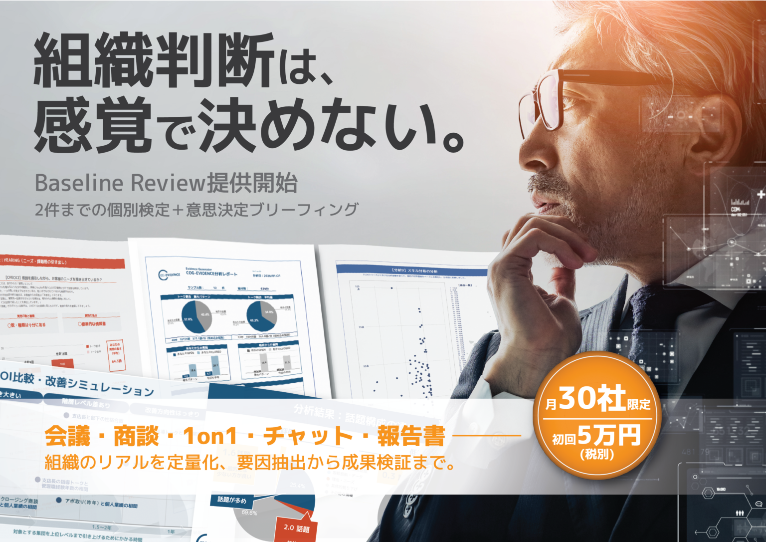 コグニティ(東京都品川区)は2026年1月26日、組織分析サービス「COG-EVIDENCE」の機能の一部である「Baseline Review(部分検定)」を単独メニューとして提供開始しました。会議・商談・1on1などの音声や書類から2サンプル分を検定し、価格は5万円(税別)です。結果の説明としてオンライン1時間の意思決定ブリーフィングも付けます。