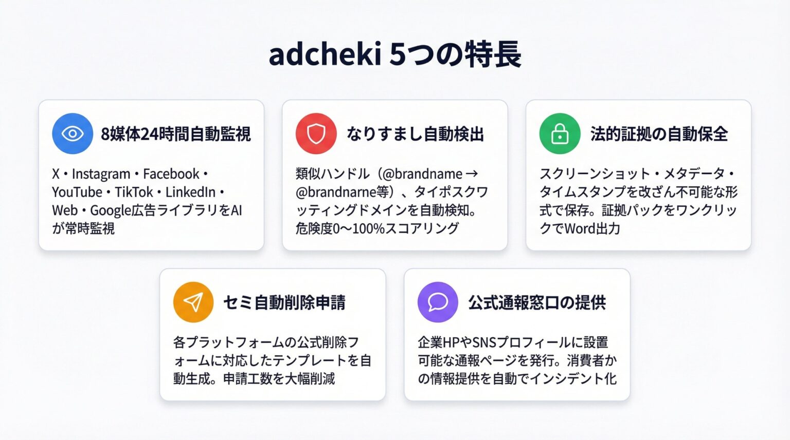 adchekiは類似ハンドルやタイポスクワッティング(紛らわしい表記のドメインの悪用)を自動検知し、スクリーンショット等の証拠を保全します。削除申請用テンプレートの生成や通報窓口ページの発行も含め、対応時間を1件あたり3〜5時間から15分へ短縮できるとしています。早期検知による損失回避率は約70〜90%で、Pro年間契約180万円を前提にROI最大40倍を見込むとしました。