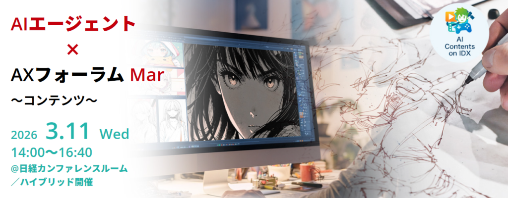 AIデータ株式会社は、コンテンツ業界のAI活用とDX推進、IP戦略をテーマにした「AIエージェント×AXフォーラム Mar.~コンテンツ〜」を2026年3月11日14:00~16:40に開催します。会場は日経ホール&カンファレンスルーム(東京・大手町)で、受付は13:45開始です。ハイブリッド形式で行われます。