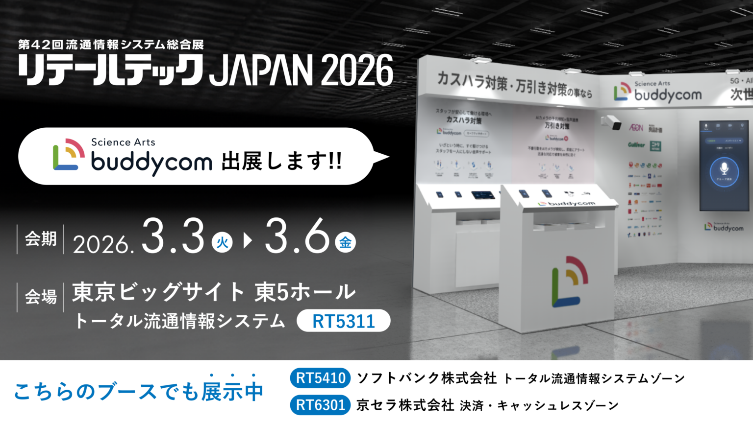 サイエンスアーツ(東京都渋谷区)は2026年3月3日〜6日、東京ビッグサイト東展示棟で開かれる「リテールテックJAPAN 2026」にインカムアプリ「Buddycom」と周辺機器を出展します。会期は10時〜17時(最終日は16時30分まで)で、同社の小間番号はRT5311です。入場は無料ですが事前登録制です。