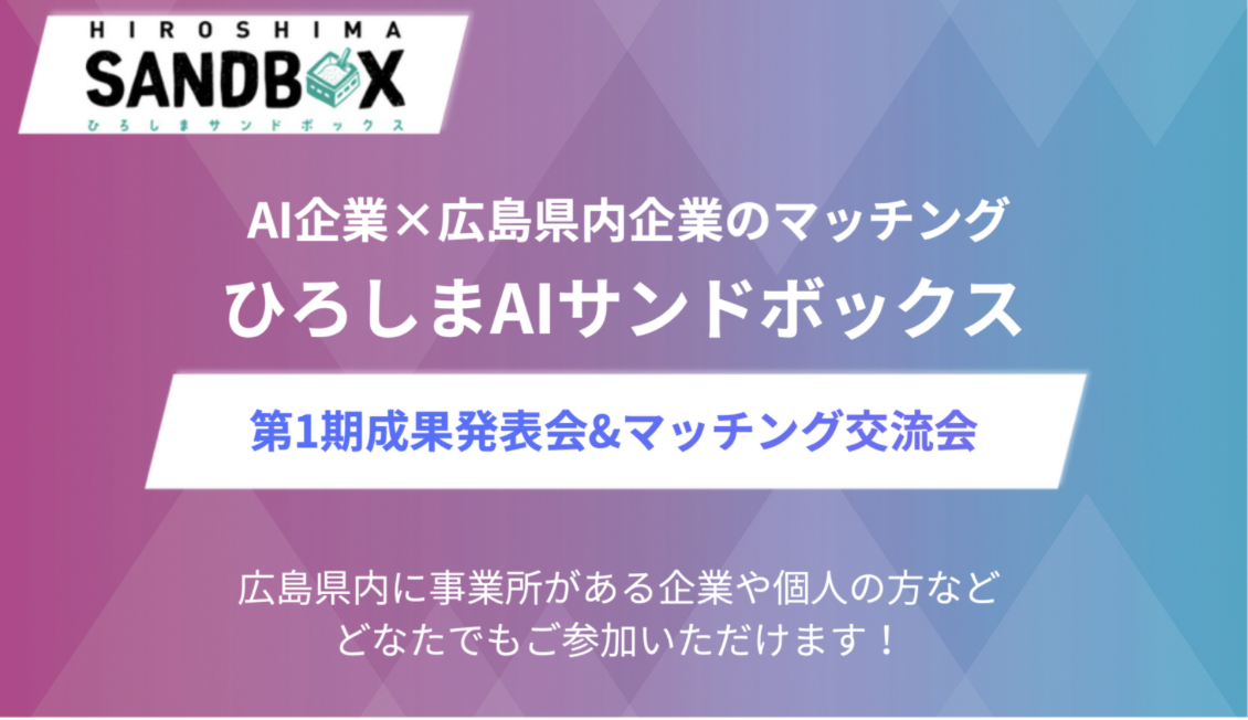 同イベントは広島県が進めるAI活用実証プログラムの成果共有と、AI開発者と企業のマッチングを目的としたものです。AIサンドボックスは、企業課題に基づき複数のAI開発者・事業者と組み、実証検証を進める枠組みで、DX(業務のデジタル化による変革)につながる協業創出を狙います。