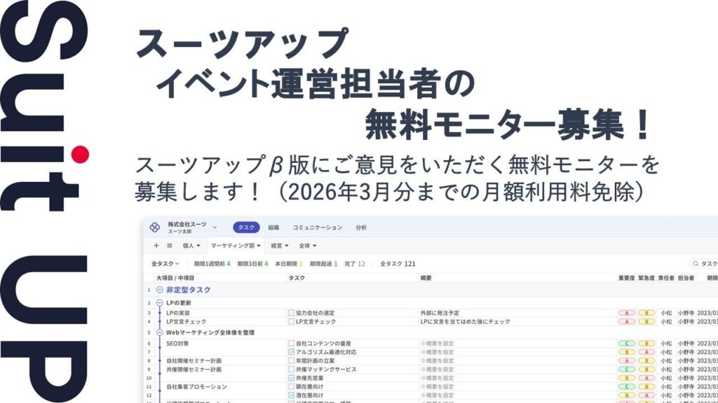 株式会社スーツ(東京都千代田区)は、AIタスク管理・プロジェクト管理ツール「スーツアップ」で、イベント運営担当者を対象に無料モニター3社の募集を始めます。対象は2026年1月22日〜1月30日にβ版の7日間無料お試しへ申し込んだ企業で、応募はメールで受け付けます。